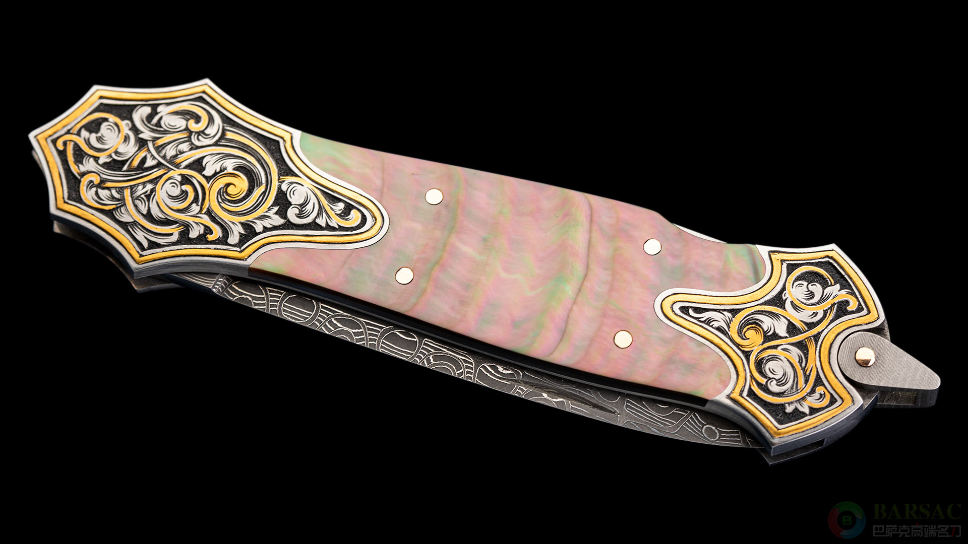 这款湖畔花园作品对称剑刃由托马斯不锈钢大马士革制成,单面开刃,传统指甲开刀槽。刀柄采用416不锈钢制作而成,中部镶嵌精美的深海黑贝母,并采用黄金铆钉固定。黑贝母优美梦幻的色彩如同梦幻湖泊,两侧雕刻的精美卷叶花卉图案构成了花园的美景,黄金的运用使奢华度再次升级。
