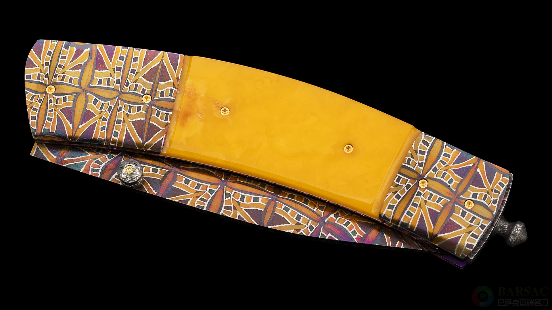 这件大尺寸五彩绿洲作品很有分量,大面积的采用了异常华丽的爆炸纹大马士革于刀刃和护手,手柄则镶嵌了展示级琥珀,展现了一幅在金色沙漠中五颜六色的绿洲画面。折刀的大马士革推钮镶嵌钻石,开合顺滑,声响悦耳。