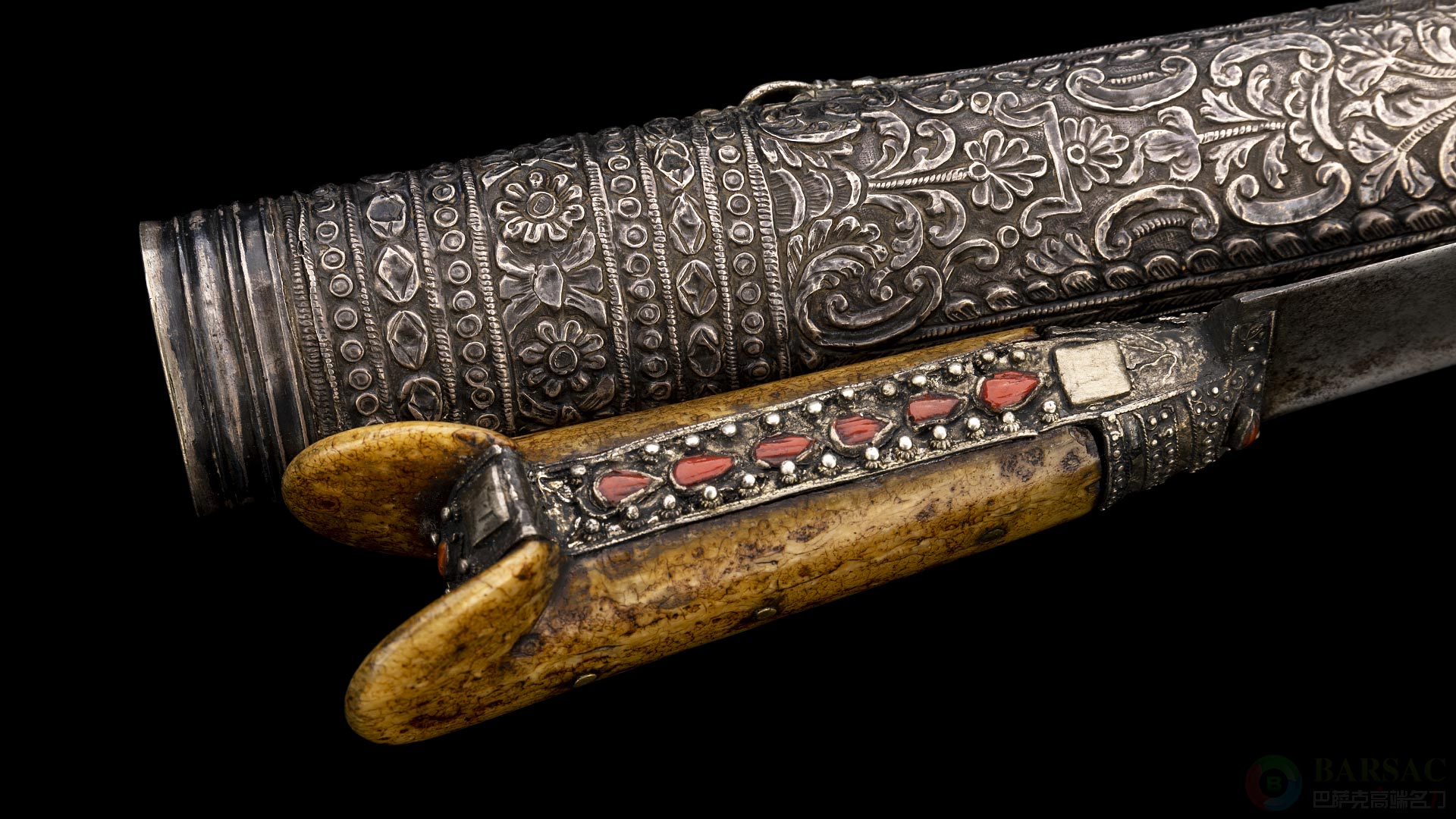 刀鞘为木胆包银制成,表面满覆盖精美的卷叶花卉图案雕刻,琳琅满目。整件作品保存良好,就年份而言可算品相优异,是西亚古兵收藏的优质之选。