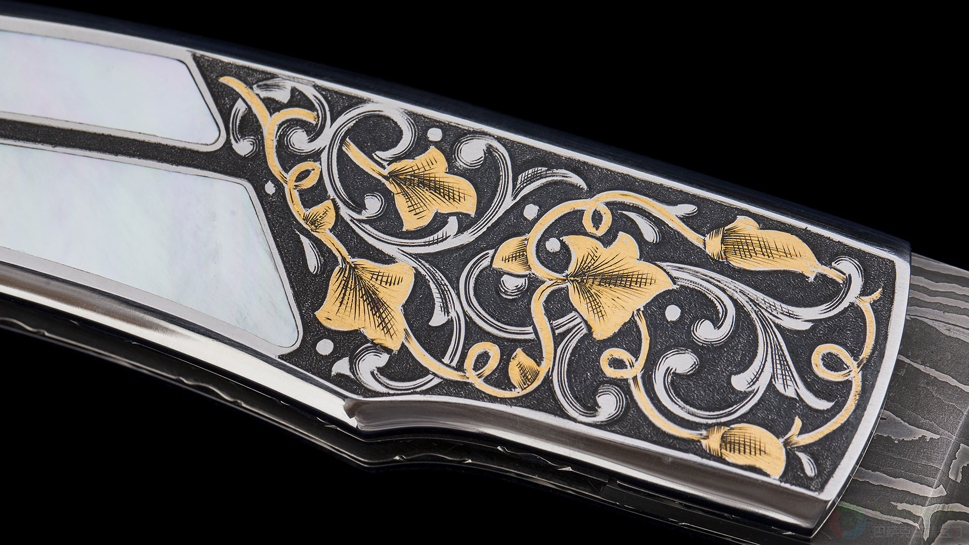 刀柄的雕刻由意大利雕刻名家卢卡·贝特拉操刀,美丽的藤蔓悬挂着美妙的黄金卷叶,雕刻细腻而生动,刀柄镶嵌展示级珍珠贝母贴片,在光线的照射下耀眼夺目。作品配高档鳄鱼皮收纳包,品味男士收藏之选。
