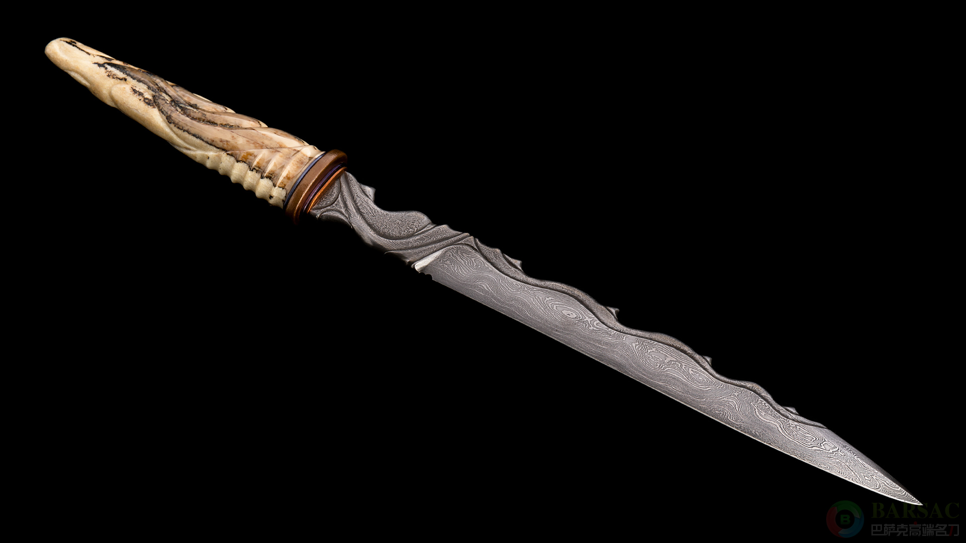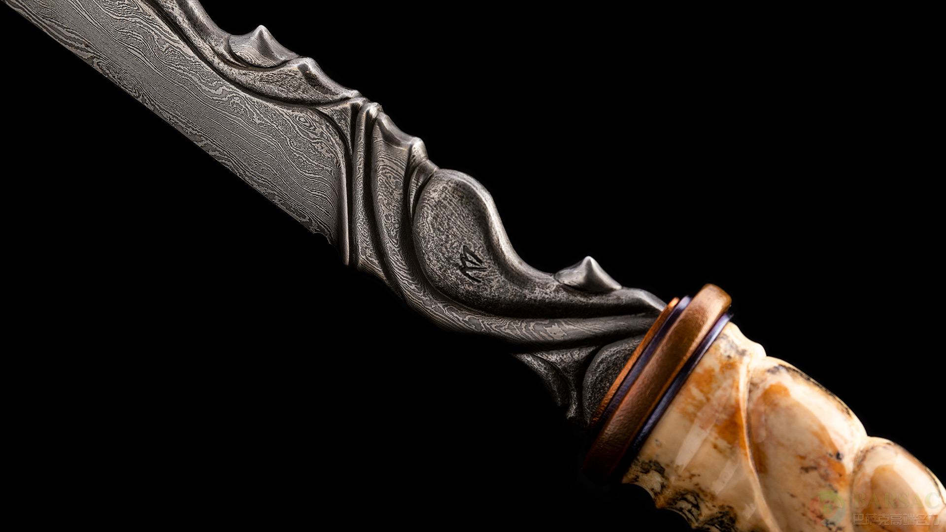 从天然材料的花纹运用到雕塑做到了完美融合的艺术佳作,由美国ABS刀匠协会JS麦迪·麦瑟吉恩手工打造,孤品。麦迪90年开始职业制刀,刀匠协会大师,擅长锻造,对大马士革材料的塑形拥有天马行空般的想象力。其作品不同于其它ABS名家,凸显出强烈的个性,带有大量的雕塑元素,展示性极高。麦迪多次获得最佳艺术刀、幻想刀、展示刀大奖,作品也时常刊登在各大杂志之上。