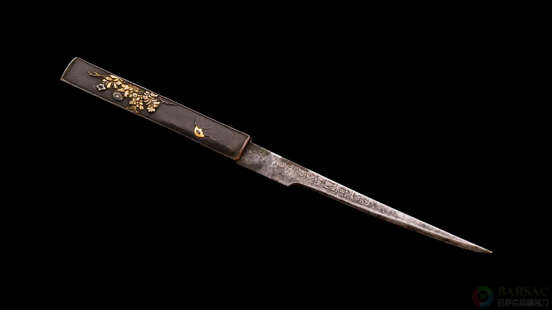 漆木刀鞘收纳,鞘上配有小柄,全长21厘米,同样十分精美的鎏金浮雕。配有白鞘用于存放刀条,木刀条装表刀拵,刀袋收纳。此刀极具年份,保存至今依然品相卓越,实属绝佳的日刀收藏。
