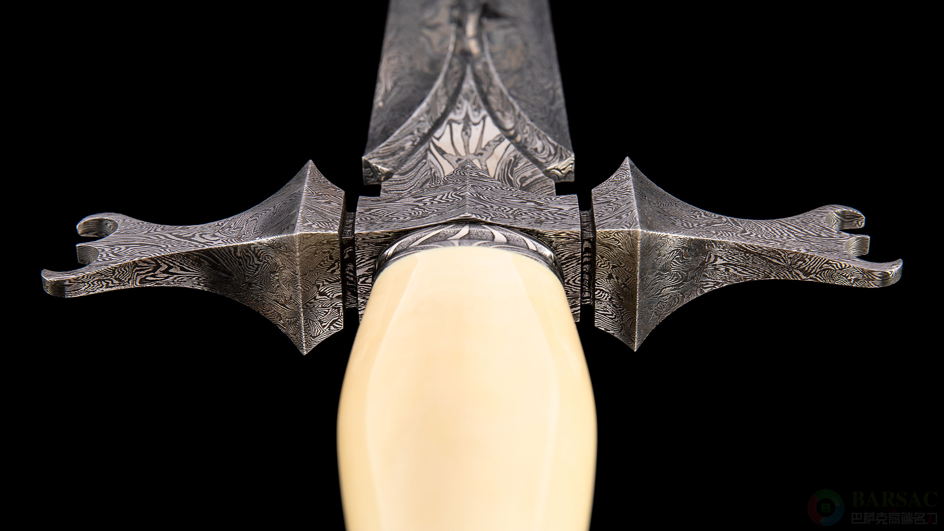 手柄线条刚毅,护手像两座耸立的城堡,手柄选用精品乳齿象牙化石,手柄温润舒适,握感饱满。配有皮鞘收纳,此把作品线条设计不无彰显硬汉风范,个性男士的绝佳收藏,是不可多得的钢铁艺术精品。