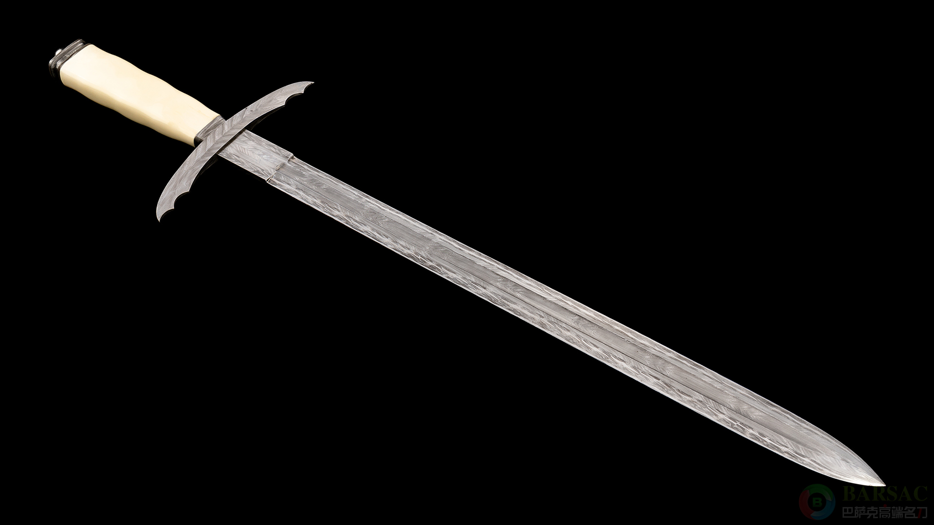此剑尺寸巨大,剑刃采用杰瑞锻造大马士革制成,花纹动感细腻,粗细有致,对比强烈,展现出大师级锻造功力。剑刃中间有一道夸大的剑槽,视觉冲击力非常强。弯曲有力的大马士革护手,如似独角仙的长角,雄壮挺拔。