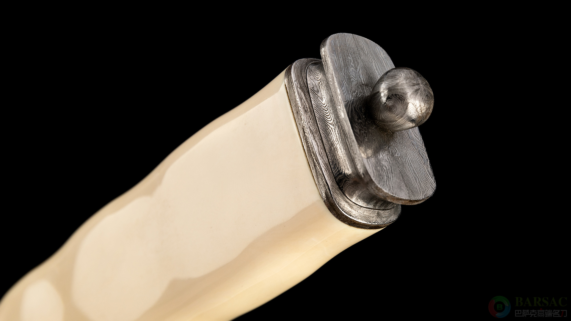 剑柄为高级材料制成,握感丝滑细腻,质感油润,让人爱不释手。尾铁同样采用大马士革制作而成,打磨精美。如此长度的复杂大马士革长剑,对锻造时的技艺要求很高,握在手里帅气威猛,尽显男人本色。