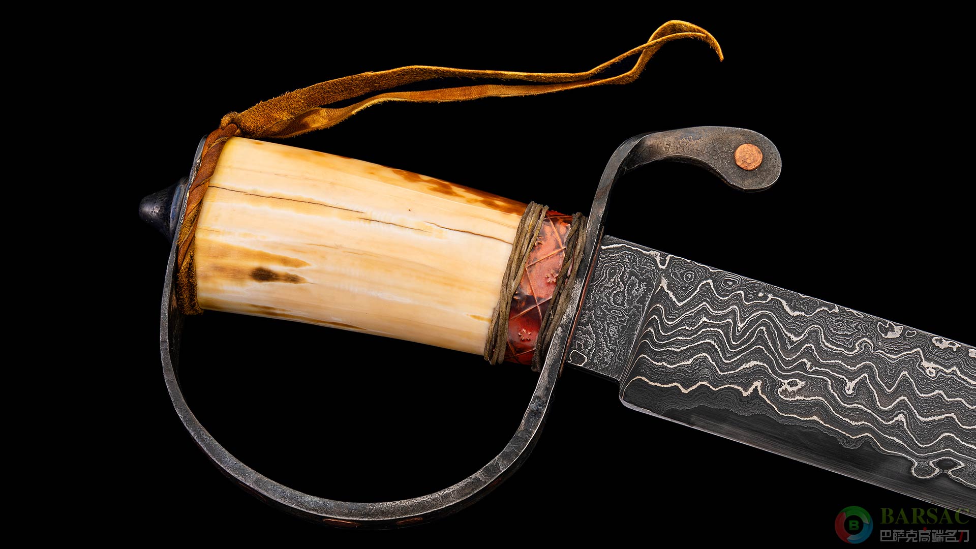 这款酋长博伊作品为肖恩最新打造之顶配,刀刃采用肖恩锻造三枚夹钢大马士革制成,大马士革部分花纹非常细腻动感,潇洒奔放,如同豪迈泼洒在画布上的油墨,浑厚有力。大气D型护手采用原始铁器回炉锻造而成,外观古朴,带有粗犷沧桑的质感,并带有古典的铜质大铆钉装饰。刀柄选用精美海象牙化石制作而成,色彩如同水墨山水画,外观质感油润,握感饱满有力。