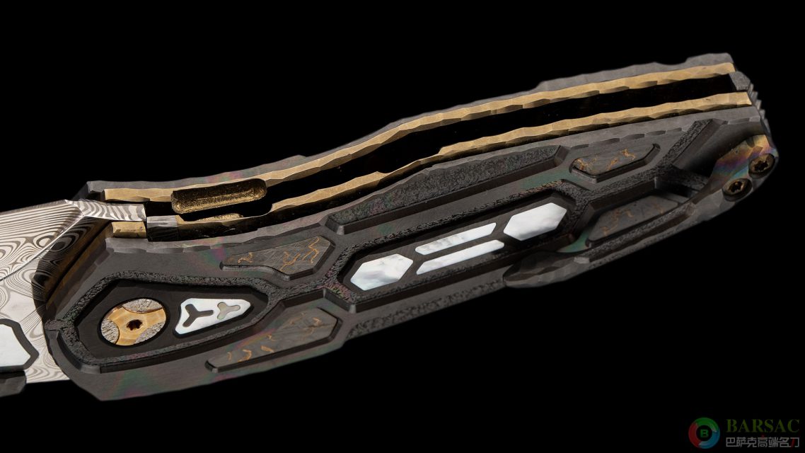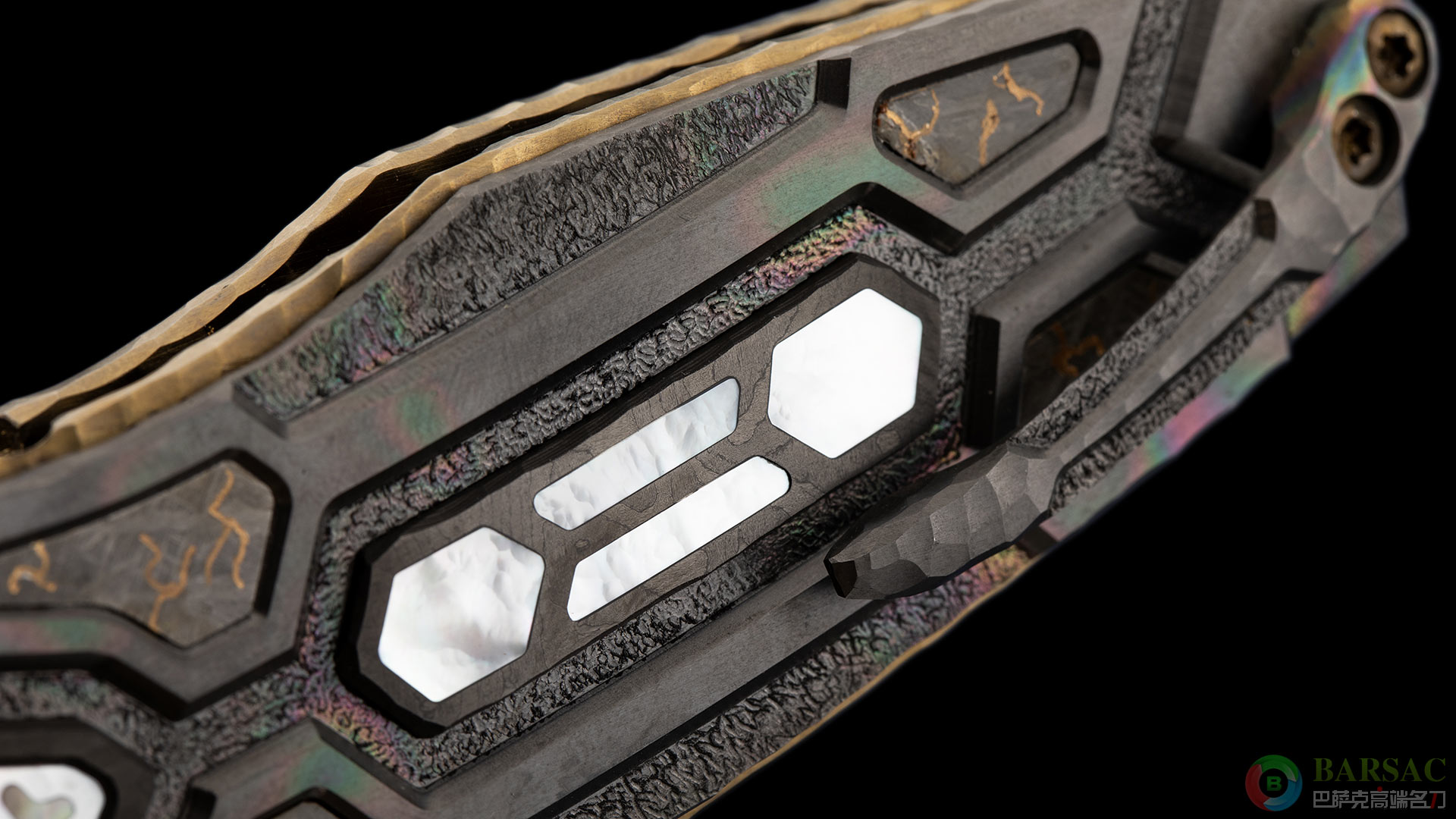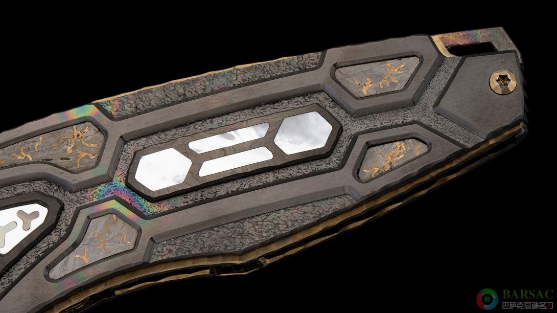 刀柄采用昂贵的锆合金框架,并进行了复杂的镂空镶嵌设计,镶嵌了昂贵的稀有金元素陨石、珍珠贝母以及碳钎维,这几种材料非常好的诠释了星战机甲的设定属性。整件作品还带有锆合金制成的背夹,钛合金刀衬、背花,所有细节尽量还原成了机甲外形,非常抢眼。整件作品制作难度很高,脑洞巨大,并带有原装礼盒、刀袋以及证书。