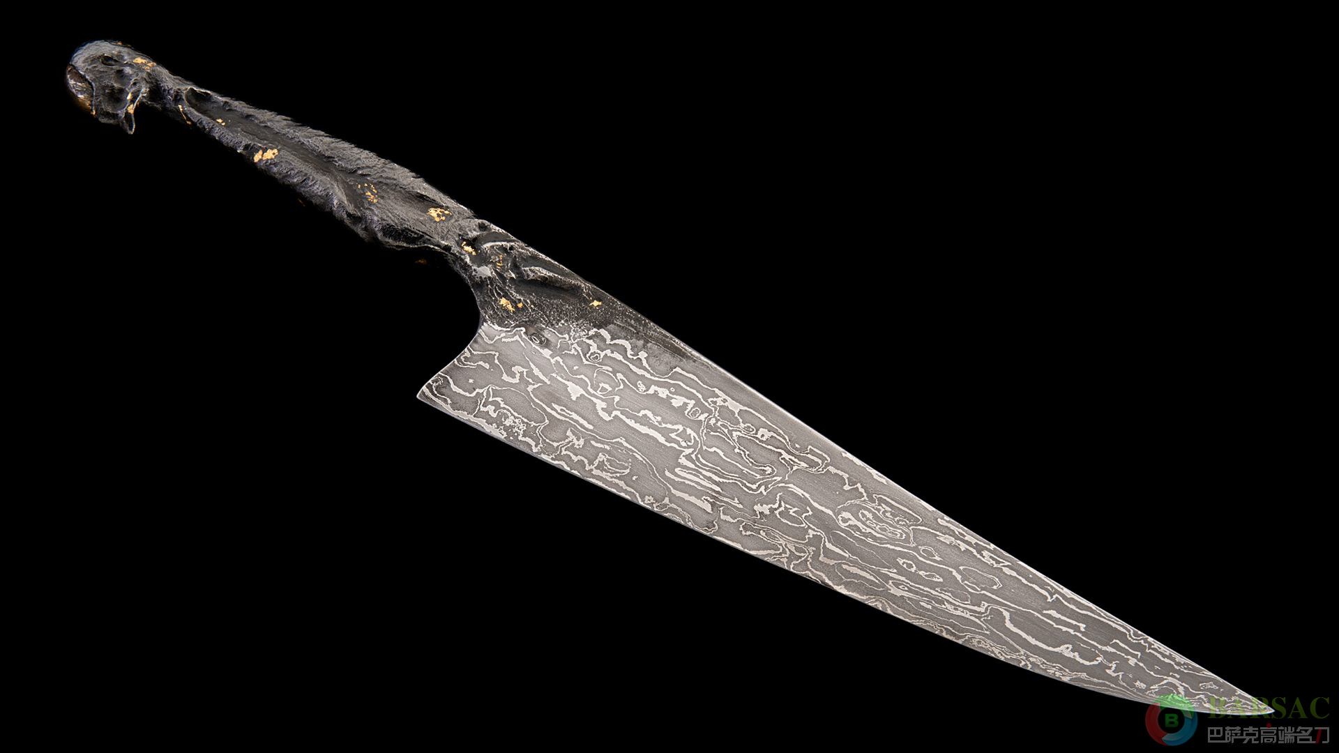 这款天外来客为一体钢构造,采用1968年发现的圣奥宾流星陨石残片混合高碳钢锻造而成,刀刃花纹粗犷大气,被作者称之为“死亡谷”大马士革。刀刃花纹带有明显的天然陨石结晶纹理,这种穿越亿万年时空的历史厚重感,将作品的神秘度拉满。圣奥宾流星约45亿年前来到地球,坠落在法国奥布香槟地区,经过研究发现它含有高浓度的黄金成分。