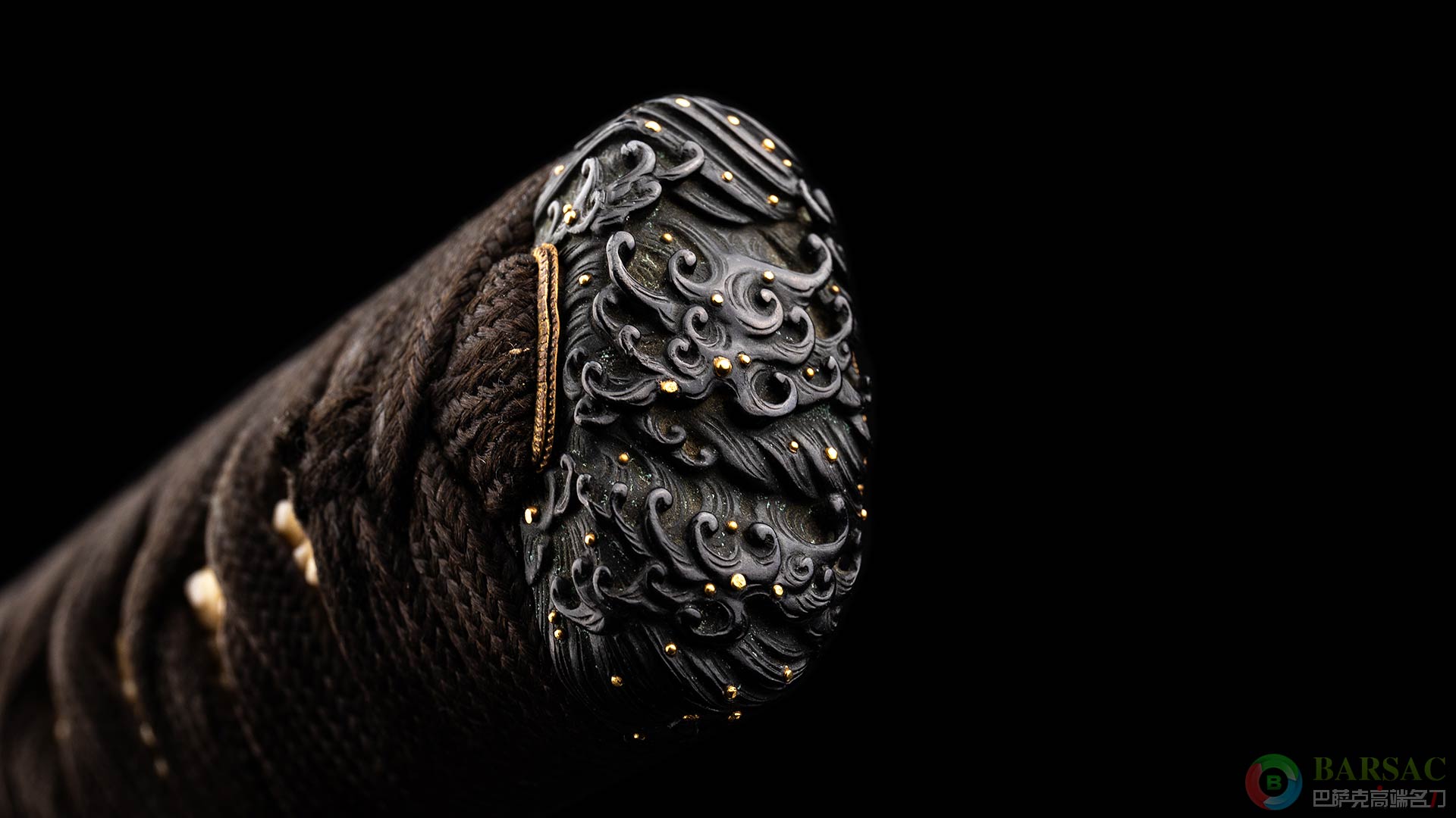 古铁海浪浮雕刀镡,带有贵金属点缀,让人感受到十足的力量感。缘、柄头同样以海浪浮雕为主题雕刻。手柄包裹珍珠鱼皮并缠有柄卷,配有浮雕猕猴目贯,目贯雕刻细腻生动并以贵金属装饰细节。刀鞘相当漂亮,大漆工艺制作表面带有肌理纹饰,简洁耐看。整刀保存完好,品相卓越,证书齐全,极具收藏价值。