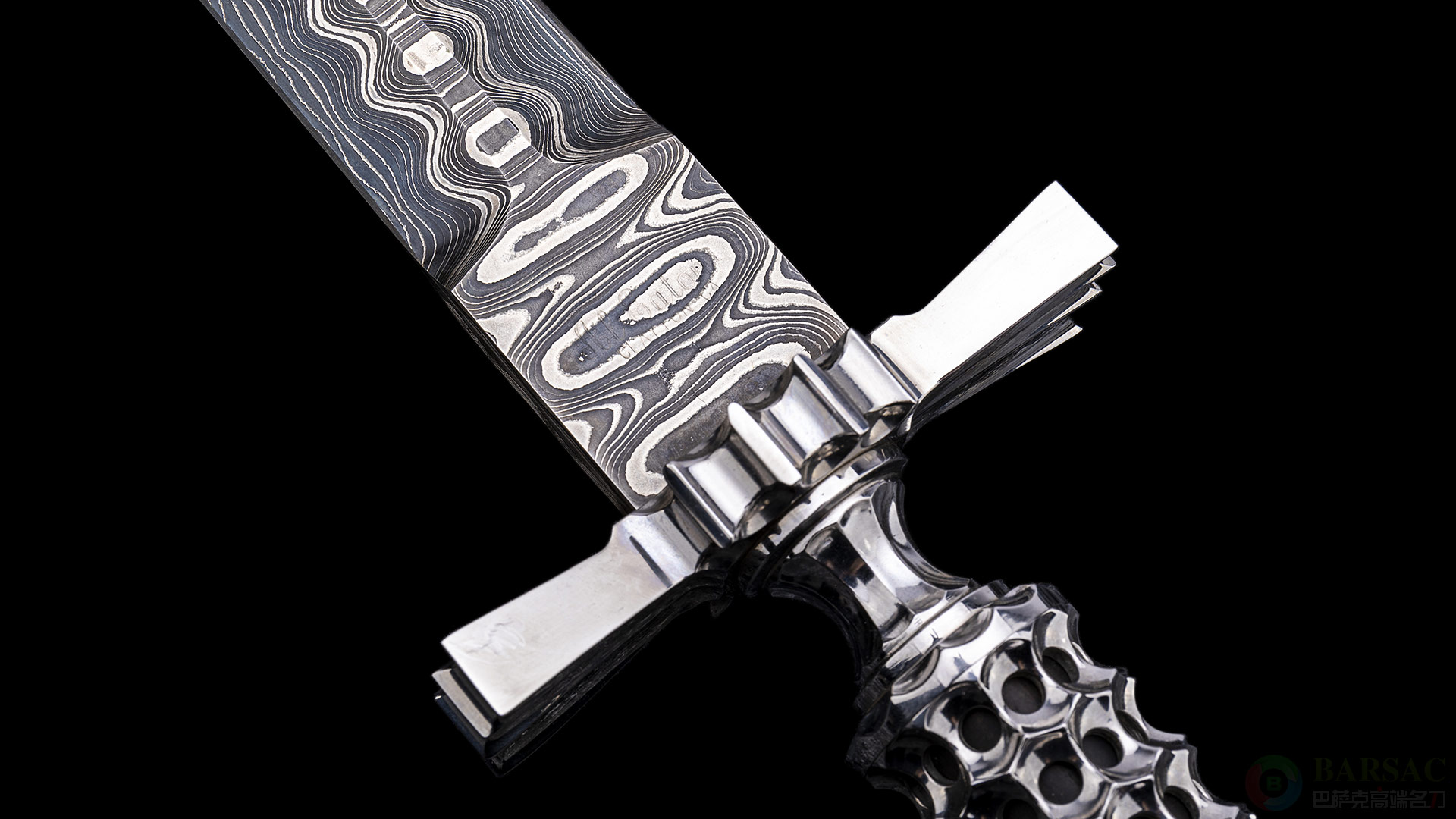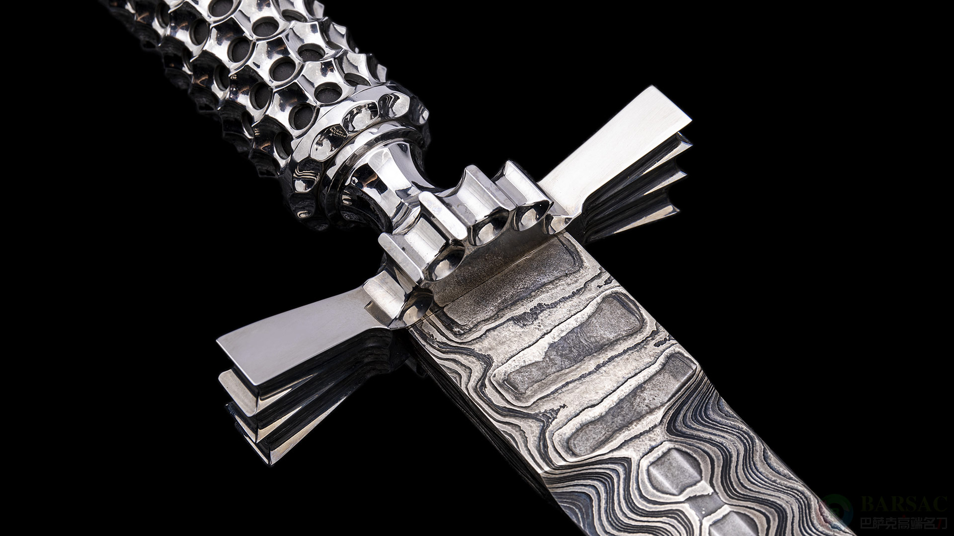 此件暗黑荆棘短剑就是埃尔这生中最具代表性的作品。全长45厘米左右,刃长30.8厘米左右,重778克。刀刃采用锻造大马士革制作而成,花纹连贯,色泽对比非常强烈。护手采用416不锈钢制作而成,经过精确的加工处理,凸显出极为锐利的棱角,表面再处以镜面抛光,形成强烈的反射效果。