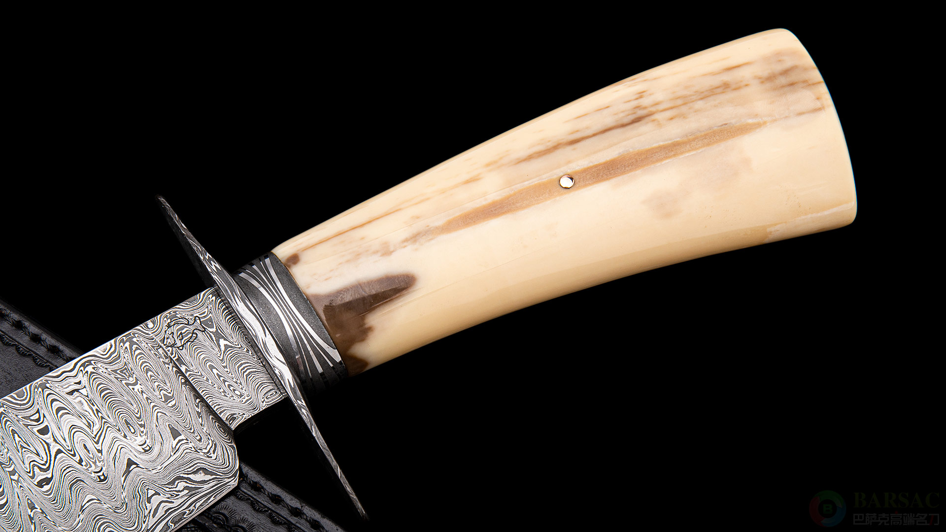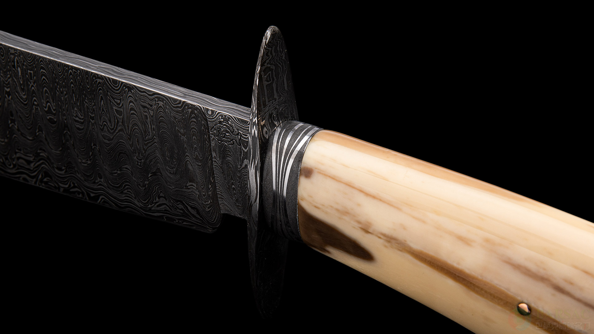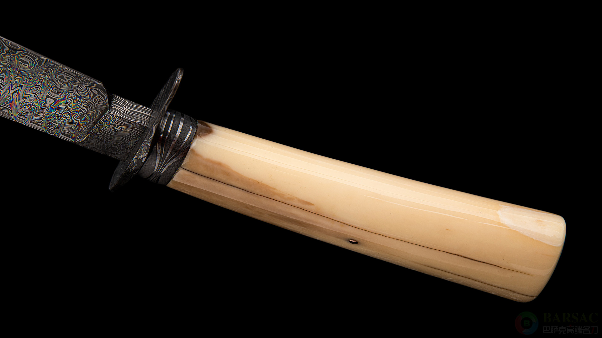 这把博伊属于绝对的”小鱼“精品,刀刃采用唐锻造大马士革钢制成,花纹极为细腻,如同巨大瀑布跌下的流水,爆发力十足。大马士革护手以及刀颈,花纹与刀刃形成强烈对比。精选的海象牙化石配黄金铆钉,不仅拥有极为卓越的质感,色彩本身也像是一幅山水风景画。