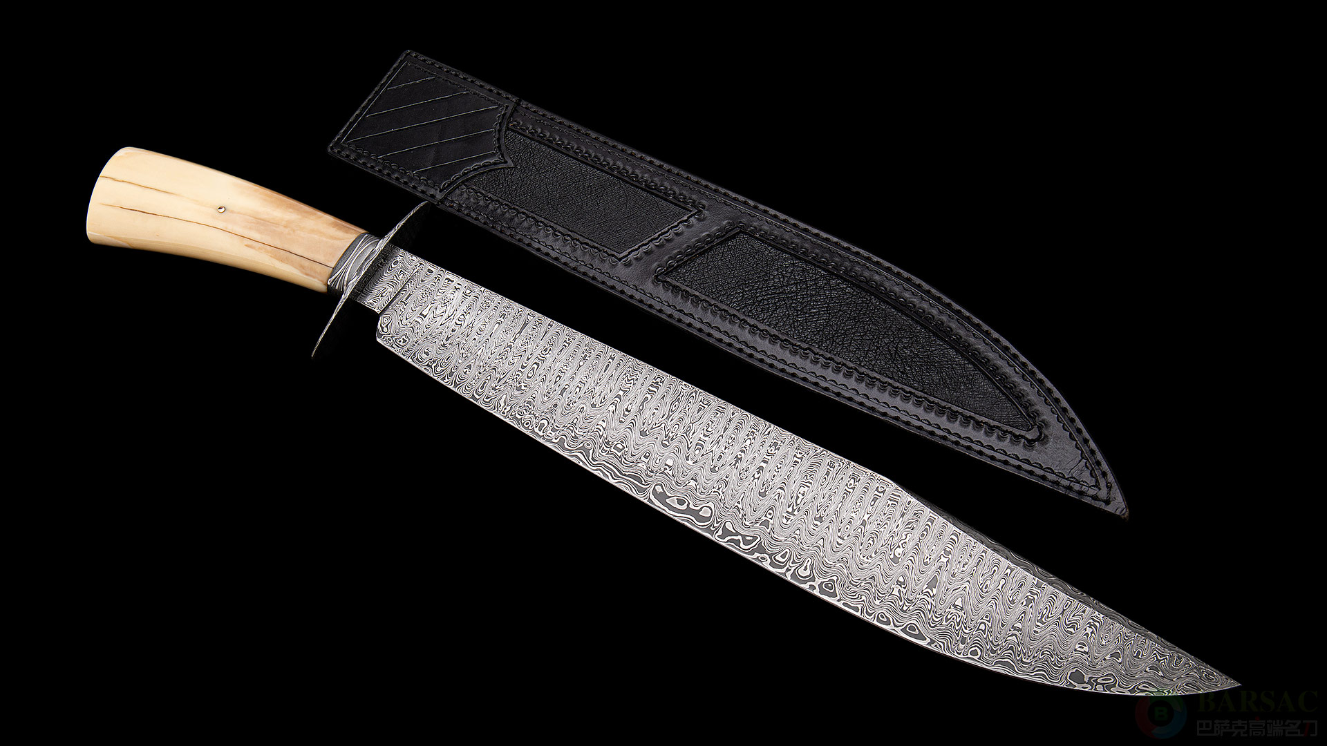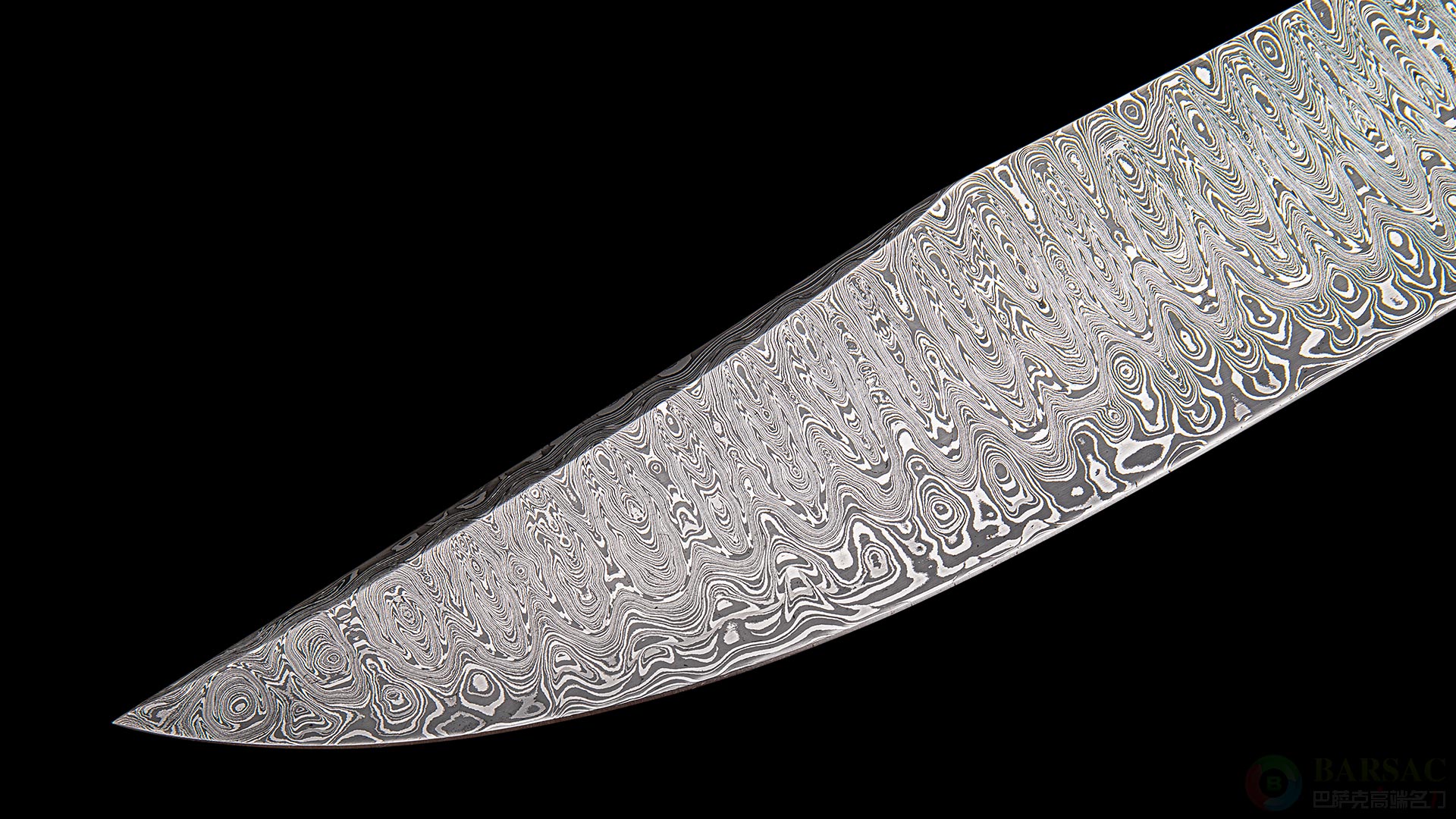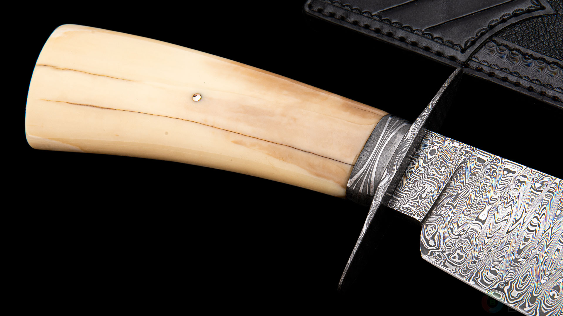 这把博伊属于绝对的”小鱼“精品,刀刃采用唐锻造大马士革钢制成,花纹极为细腻,如同巨大瀑布跌下的流水,爆发力十足。大马士革护手以及刀颈,花纹与刀刃形成强烈对比。精选的海象牙化石配黄金铆钉,不仅拥有极为卓越的质感,色彩本身也像是一幅山水风景画。