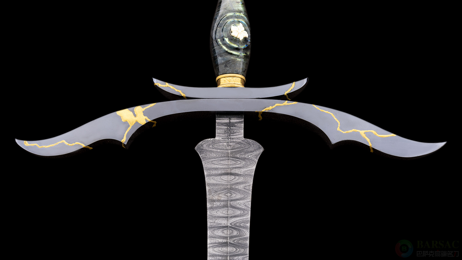 这款地底世界完美诠释了保罗的制刀天赋与艺术修为,宽大的护手使整体看起来如同一把日式十字枪,魄力十足。剑刃采用保罗锻造600层天梯大马士革钢制成,花纹卷曲连贯,质感强烈。