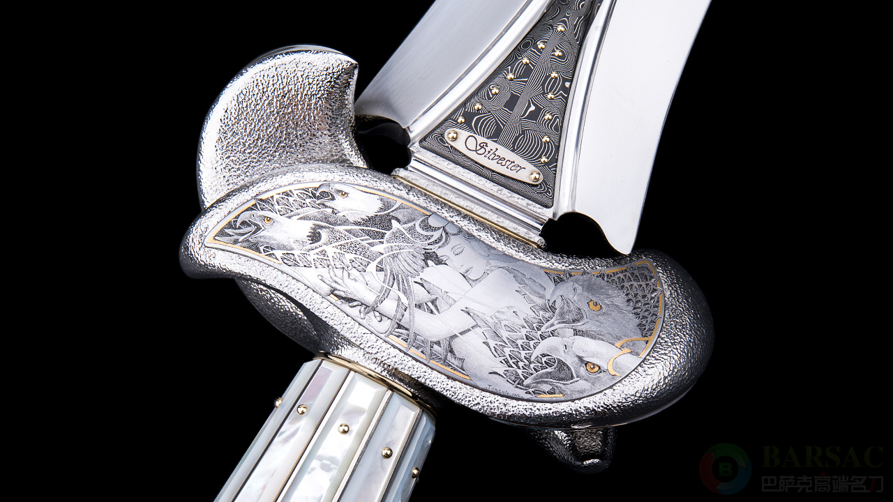 护手采用416不锈钢制成,特色的“镜像对称”外形,如同两片环抱在一起的羽翼,与剑刃末端卷曲部分相互呼应。护手内部做了大量的圆孔镂空进行减重处理,表面处理成石纹一般的肌理。护手两面各镶嵌一块不锈钢贴片,此处由马雷克运用高超的金属影雕技法,在显微镜下依靠六位数的打点构图,雕刻出了极为细腻的画面。女神们精致的面庞,婀娜的身姿如同一张大师级工笔画作,被刻印在坚硬的钢铁之上。数只神鹰如影相随,威风凛凛,翱翔于天际。鹰眼与画面边缘线条由18K 金镶嵌雕刻而成,使素雅的画面顿时光彩夺目。