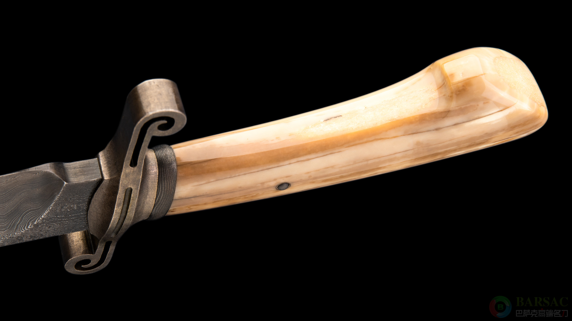 这款巨狼芬尼尔作品刀刃采用安德斯锻造大马士革制成,花纹细腻连贯,质感出众,呈现出类似天狼星大马士革的光辉花纹,宏伟壮丽。刀柄采用化石海象牙与铜制成,外形简练饱满,充满浓郁的金属气息。