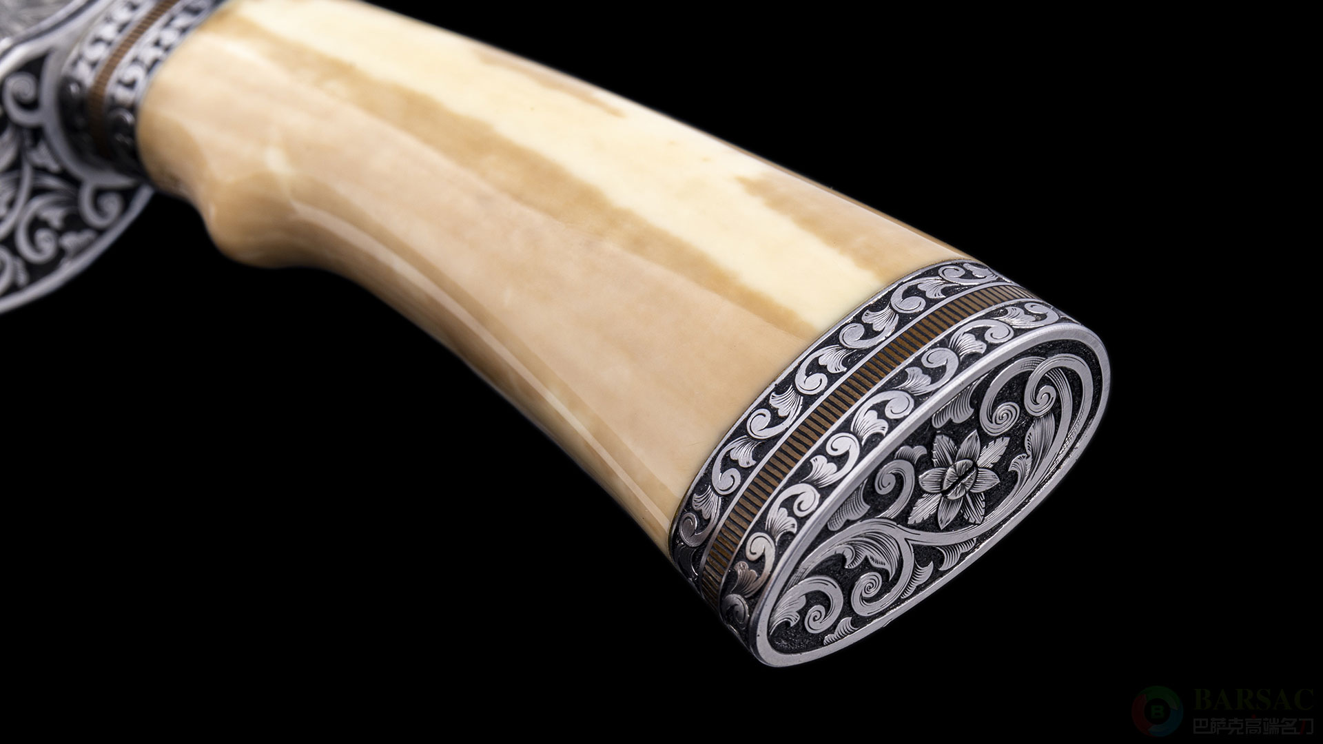 刀柄精选优质海象牙化石制成,色泽油润,握感细腻。刀柄不锈钢装具表面,展现了汤姆杰出的雕刻实力,精湛的卷叶雕刻增添了作品的华贵气息,配上精彩的大马士革花纹,整件作品的细节可谓琳琅满目。刀鞘采用牛皮制作,中间镶嵌蟒皮,完美匹配宝刀。汤姆的作品极度稀缺,此种精品更是难能可贵,绝对是ABS收藏里的优质之选。