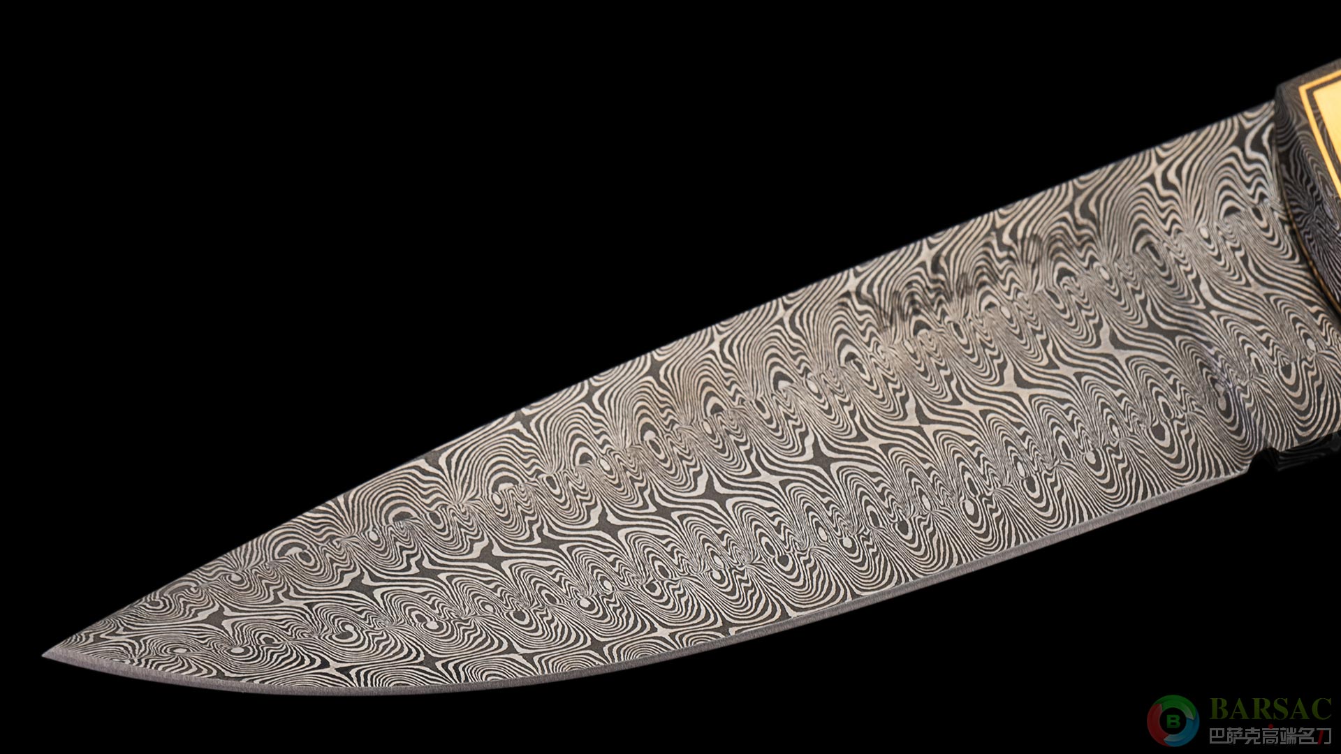 整件作品除了华丽之余艺术设计非常巧妙,暗淡的灰色卷叶如同阴影一般包裹在璀璨的黄金枝叶之内,黄金枝叶照射到的地方由于采用了不同的酸洗方式,则呈现出漂亮的梦幻午夜之色。一块大马士革实现了3个层次的色彩变幻,并微妙地构成了一幅和谐且有深度的画面,足见作者功力深厚。此件作品采用线锁设计,开合顺滑机能优秀,让人爱不释手。