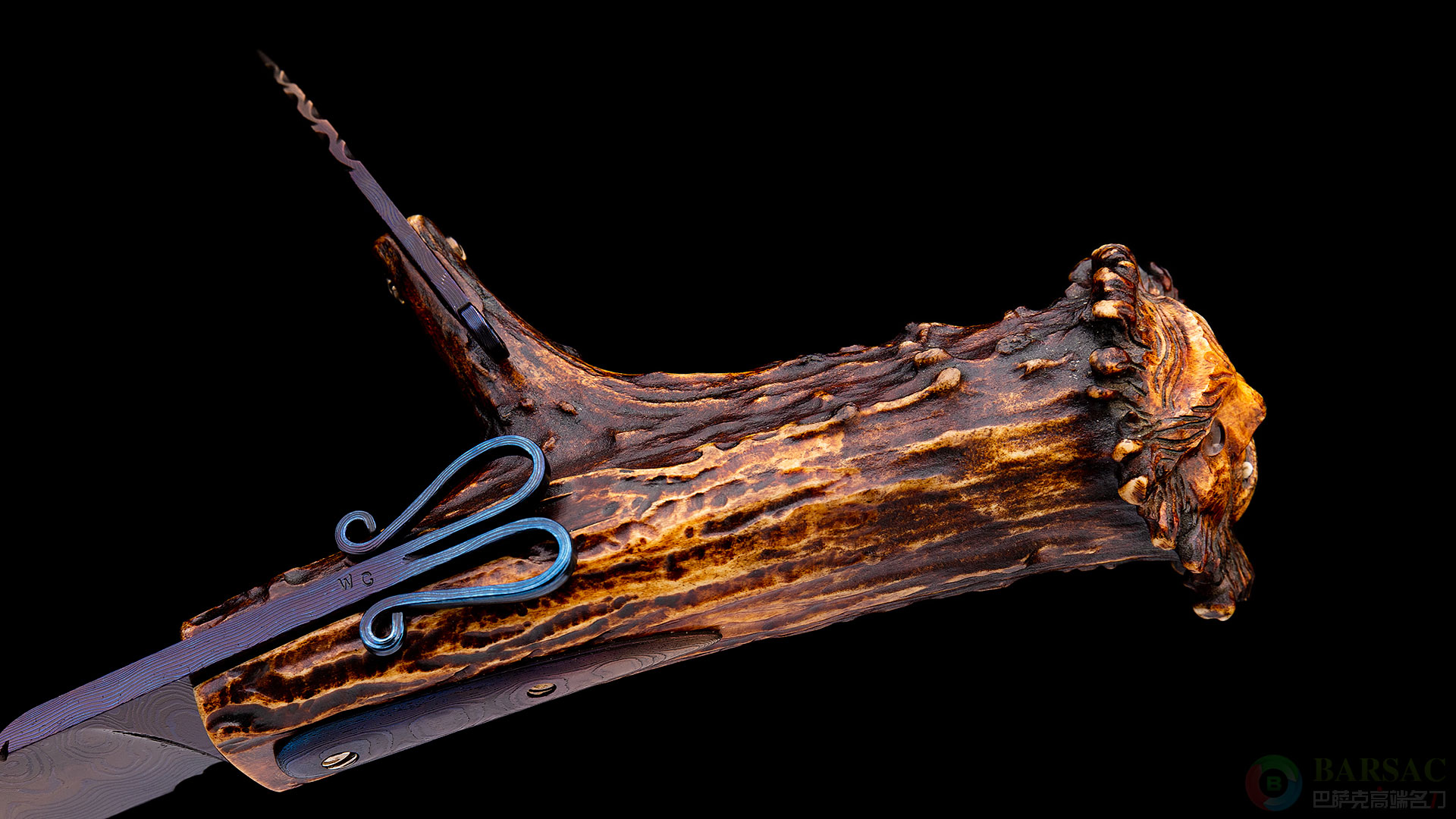 这把林中魅影为韦德哥布林里的战斗机,大马士革由韦德亲手锻造,花纹紧密连贯,加上极为魔幻的烤色,整体呈现出一股神秘味道。刀柄精选开叉形鹿角角冠,巧妙利用天然构造打造了一把附刃,如同哥布林的爪子,非常醒目,这也使其作为仅见的双刃哥布林。