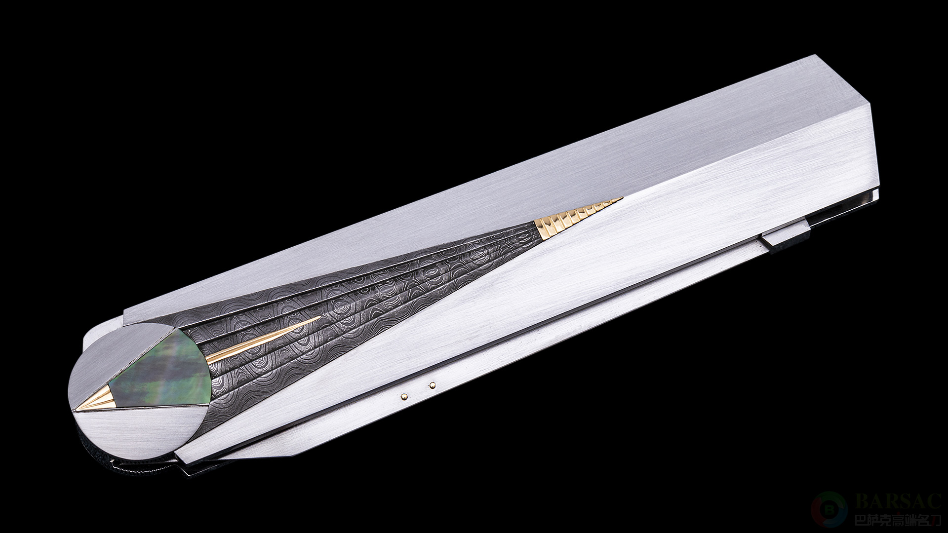 416不锈钢刀柄镶嵌大马士革、14K金以及深海黑贝母,刀柄外观呈现出新艺术风格的精髓,给人现代时尚的视觉感受。刀柄侧面使用了大量的几何元素设计进行装饰,14K金研磨成”金字塔“形状浮雕镶嵌其中,与14K金铆钉起到了点睛之笔。