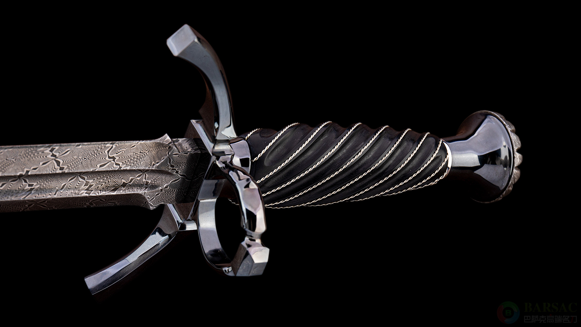 这款黑骑士短剑剑刃采用杰森锻造马赛克大马士革钢制成,优美的繁花纹规则排列,形成壮阔的花海,气势非凡。剑刃打磨对称细腻,中部带有精美的大凹槽,犀利倍增。大气的指环护手采用中碳钢研磨而成,指环外观像是一枚戒指,整体采用烤蓝处理,色彩华丽而沉稳。剑柄采用黑色G10研磨而成,经典的扭花螺旋外形,凹凸有致极具手感,再加上银丝掐丝装饰,与剑身其余部分额外匹配。
