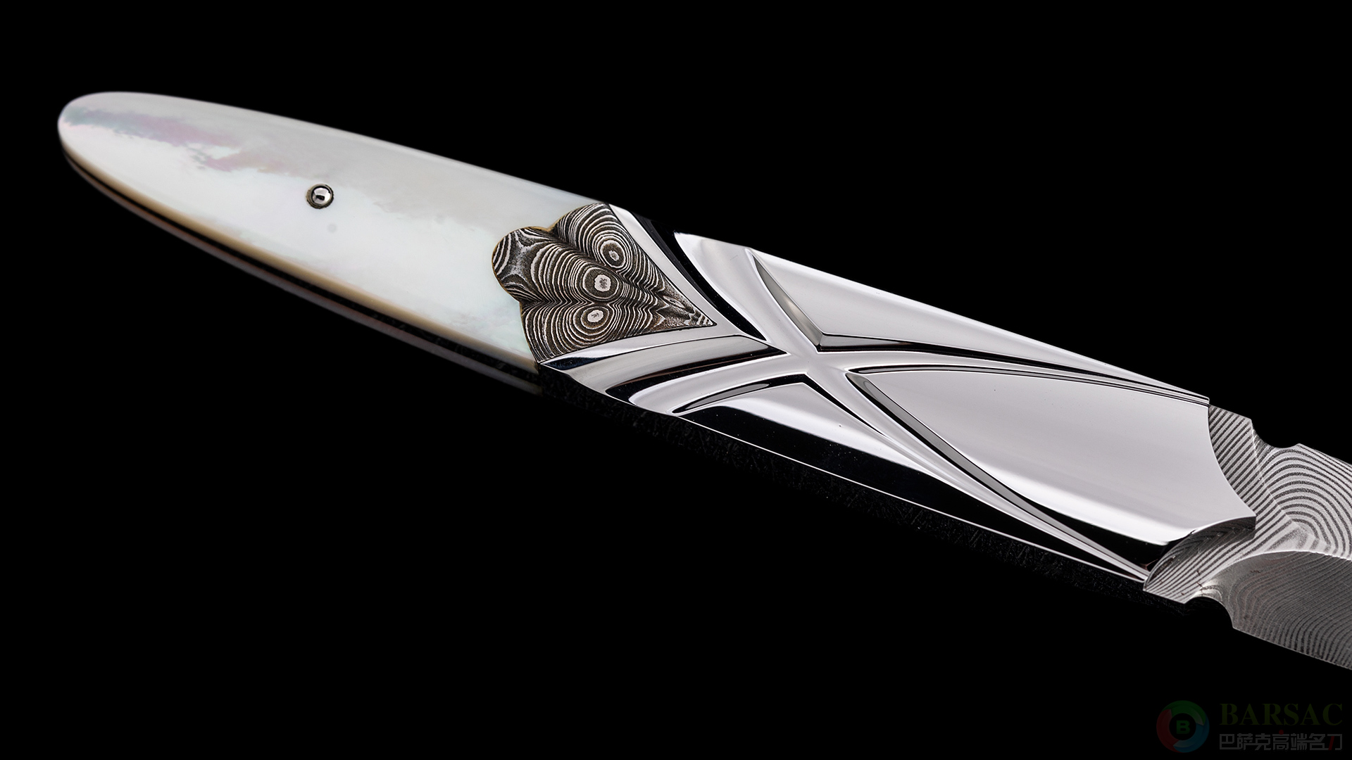 这件精美的鞘刀双刃作品采用大马士革、416不锈钢以及珍珠贝母制作而成。虽然小巧,然而沃夫冈的精髓一览无余,优美的线条、光洁的表面以及极度立体的大马士革镶嵌,每一个细节都展现了一代大师作品的独特魅力。