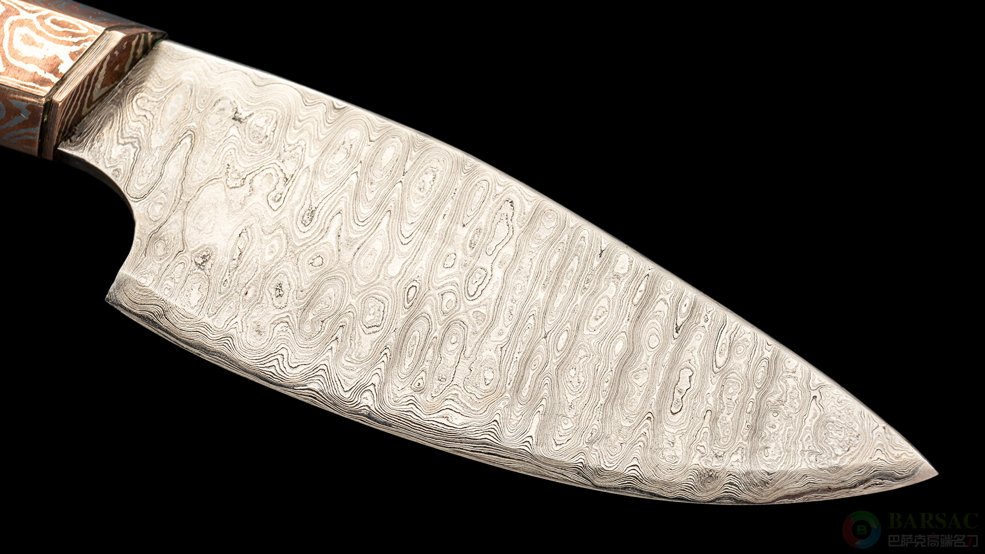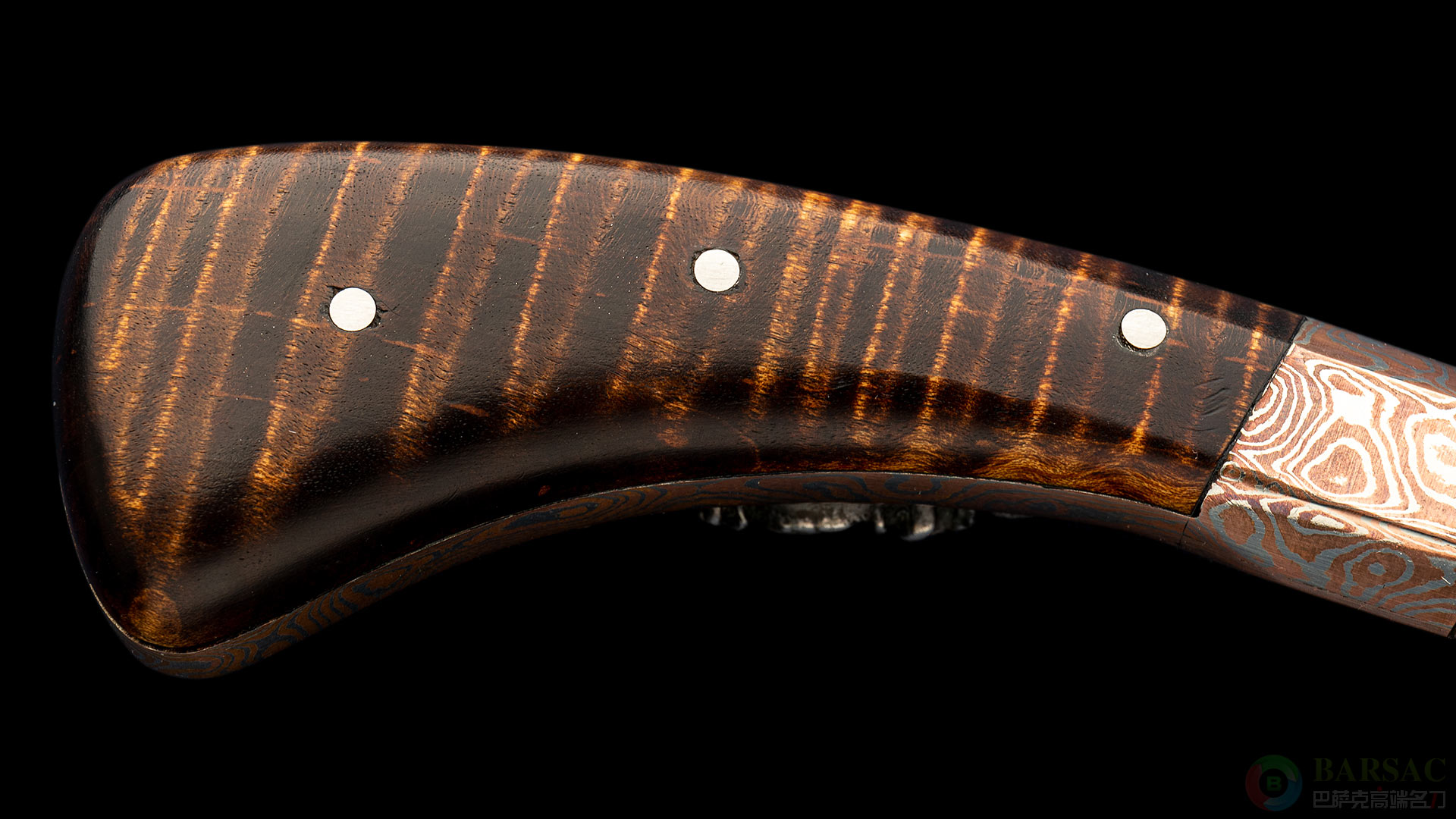 刀柄为修斯制作铜马士革框架刀柄,色彩艳丽,搭配精品美洲花梨木,同时具备极为舒适的手感。刀柄正面有一条威风凛凛的腾龙浮雕,浮雕采用纯银制作,生动立体,细节刻画精湛。从刀刃到刀柄,通过大马士革与雕刻组合,把龙与雨巧妙地结合在一起,完全符合中国元素设计。