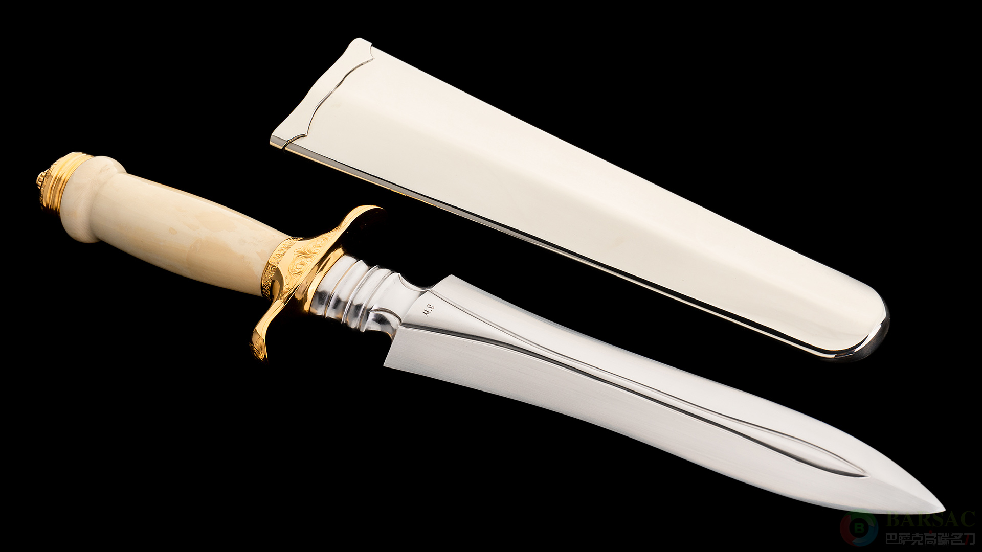 宝剑入鞘之后整件作品的体力感再次升级,可以想象如果再加装一个矛杆,毫无违和之感,可见艺术家对各种兵器的比例把握达到炉火纯青的地步。放眼所有ABS短剑作品,此件作品虽然不算长,但是给人的魄力确实名列前茅,此件作品是道格近半个世纪以来的呕心沥血杰作,请精心欣赏。