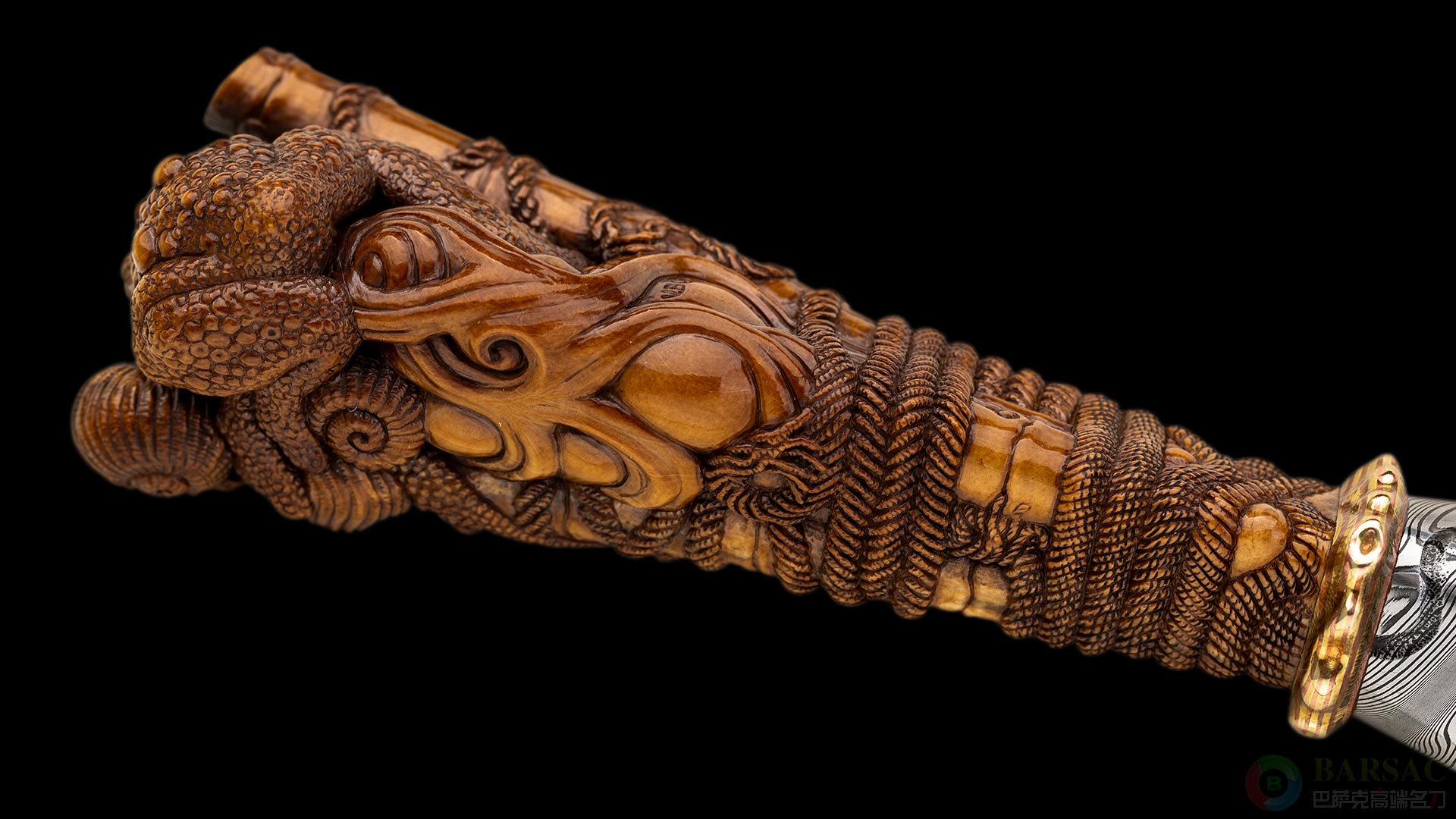 这款竹栏上的蟾蜍作品刀刃采用大马士革不锈钢制作而成,花纹如同水波动感十足;刀刃上雕刻了写意的刀槽与突起,以此比拟竹栏上的麻绳飘荡在水里的印象。护手采用铜马士革打造而成,抛光细腻,闪耀着金灿灿的光辉。