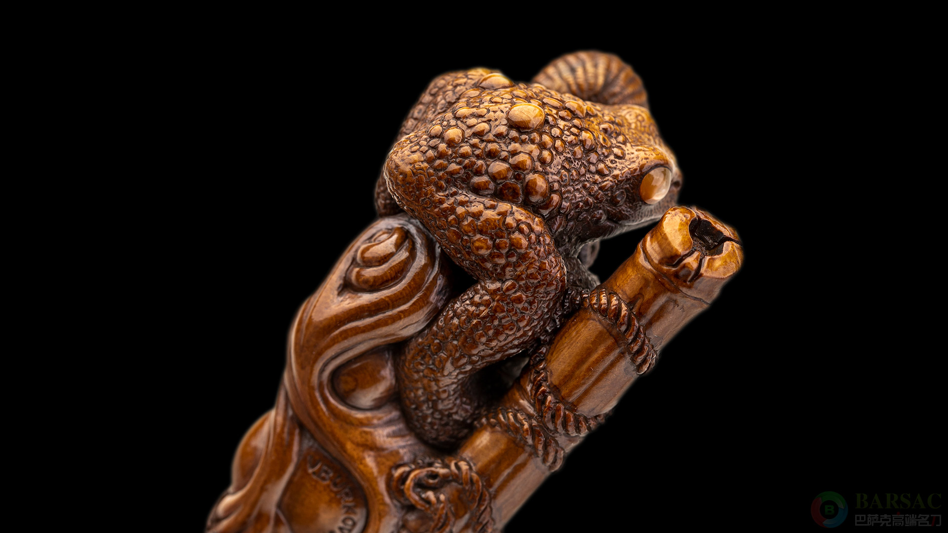 整个刀柄展现了维拉基米尔大师级的雕工,一只蟾蜍与蜗牛栖息在竹排顶端,像是两个亲密的朋友眺望着远处的世界;蟾蜍的眼睛采用珍珠镶嵌而成,波光粼粼,还原度极高。此件作品配有手工制作的底座,简约别致,巧妙地撑起了整件作品。