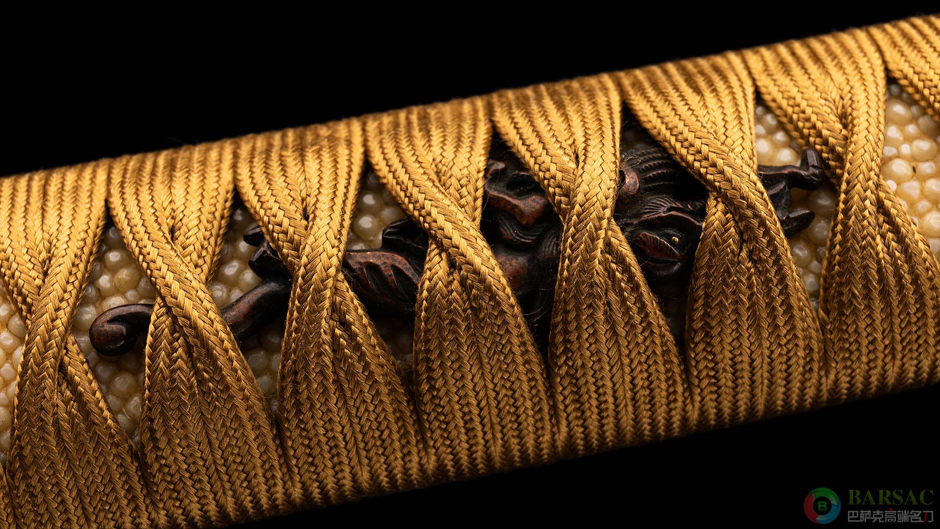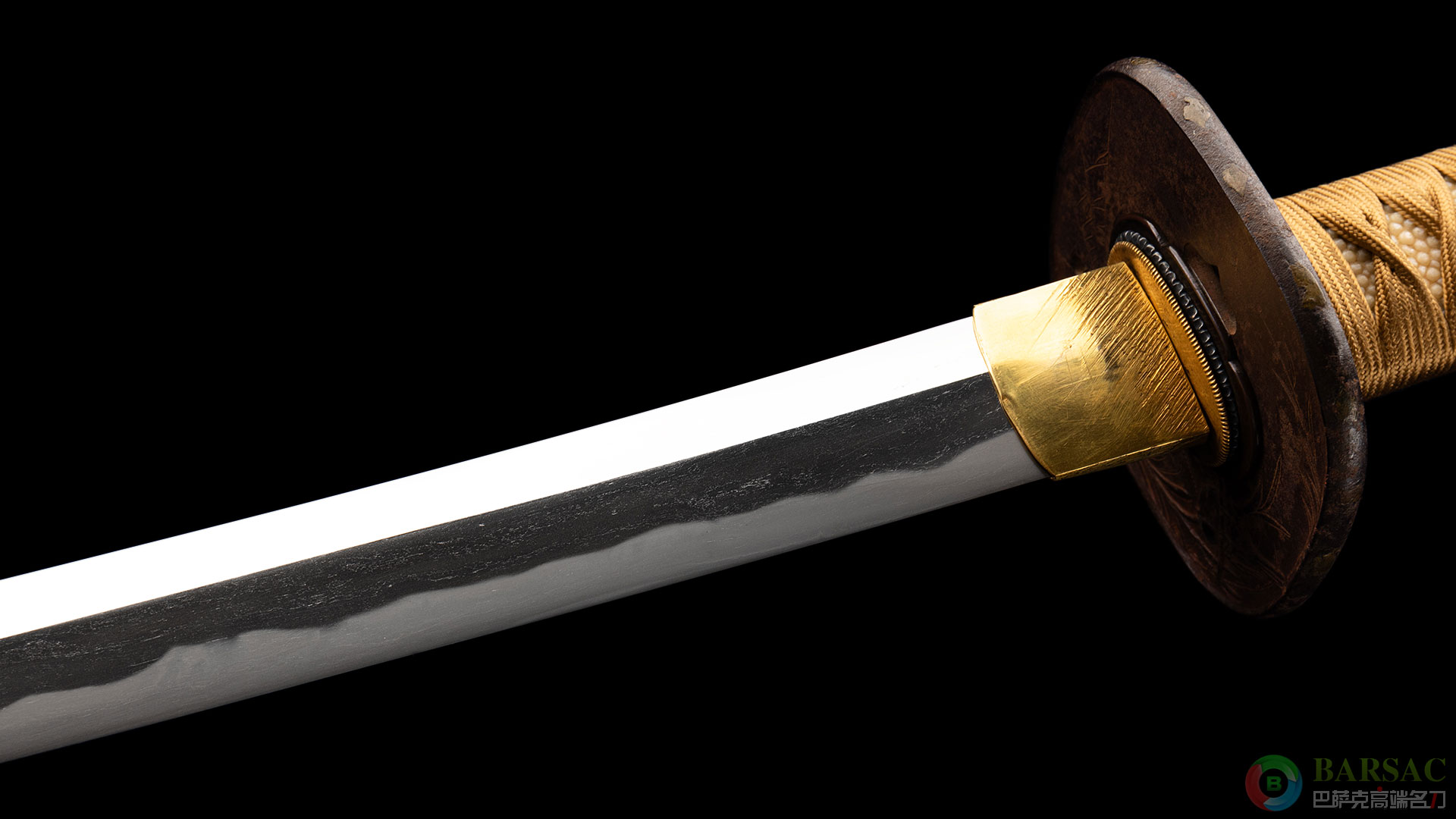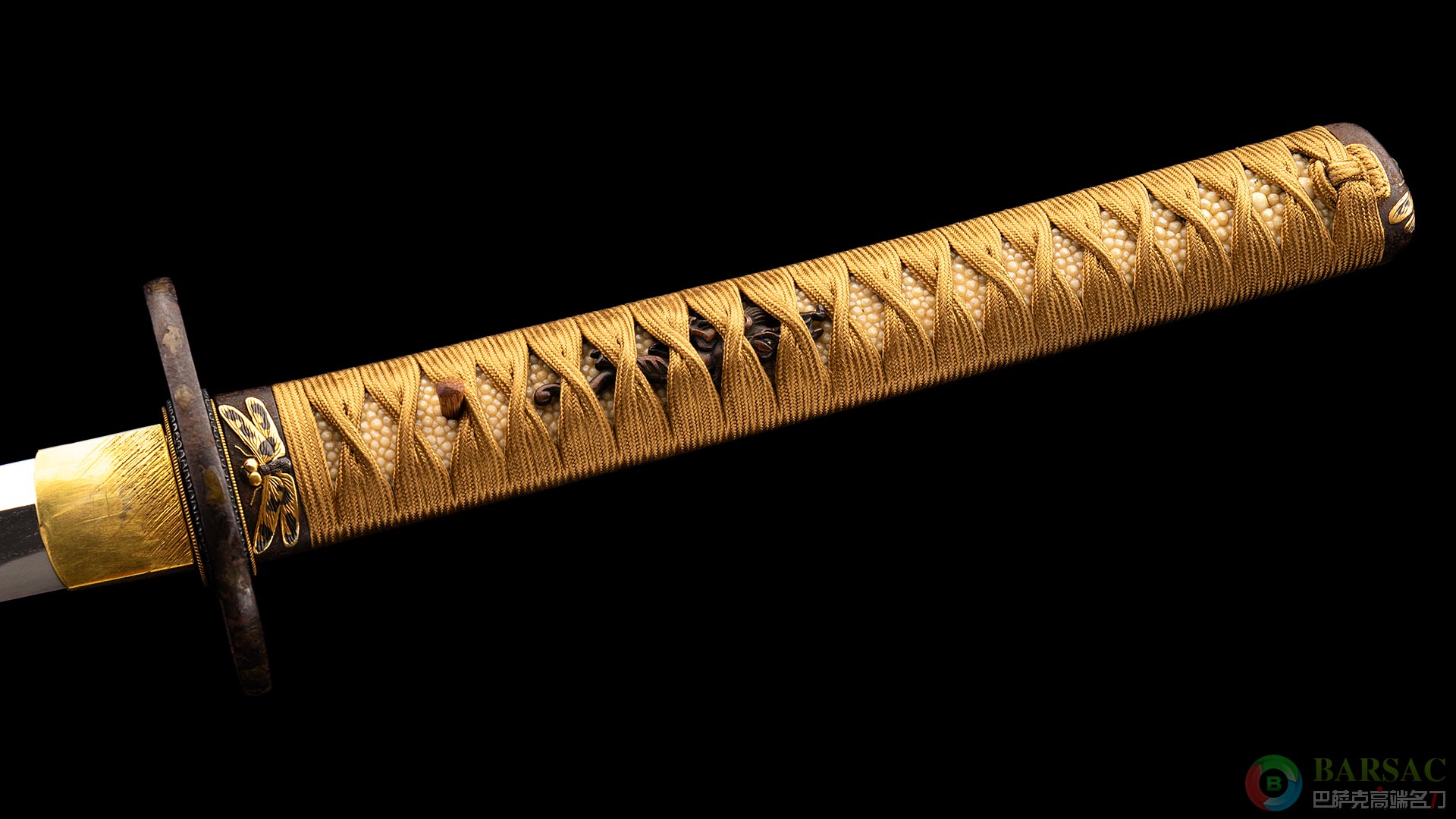 手柄包裹珍珠鱼皮并缠有柄卷,配有浮雕铜制目贯。刀鞘同样漂亮,大漆工艺制作表面带有肌理纹,鞘配有铁档做保护。整刀保存完好至今依然品相卓越,证书齐全,值得收藏。