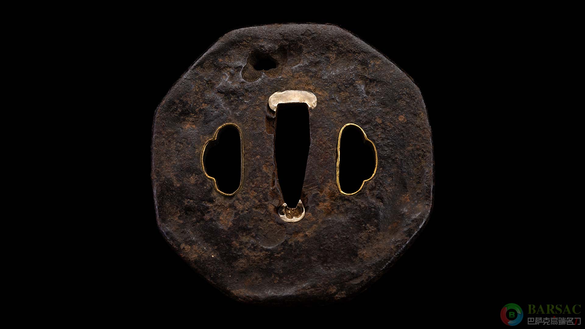 古铁刀镡,大气威武且古韵十足。银色缘、柄头刻画了雅致的竹主题雕刻。手柄包裹珍珠鱼皮并缠有柄卷,配有浮雕铜制鎏金飞龙目贯。刀鞘相当漂亮,大漆工艺制作表面并装饰了飞蛾纹饰,如同漆黑夜里飞舞的飞蛾,极具艺术效果。整刀保存完好至今三百六十余年,品相卓越,证书齐全,极具收藏价值。