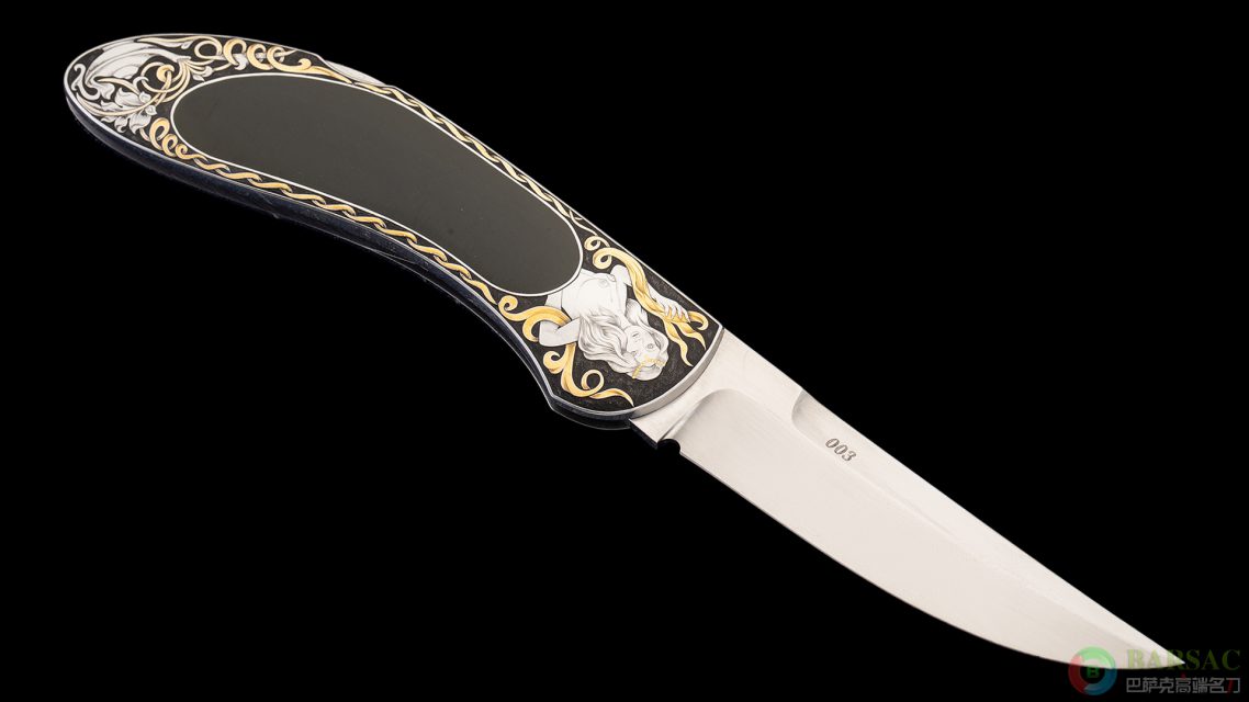 这款阿拉丁女神作品刀刃采用ATS-34不锈钢制作,犀利的分段研磨开刃搭配手工缎面拉丝处理,带传统指甲开刀槽。刀柄为416不锈钢制作并镶嵌宝石级爱德华黑玉。