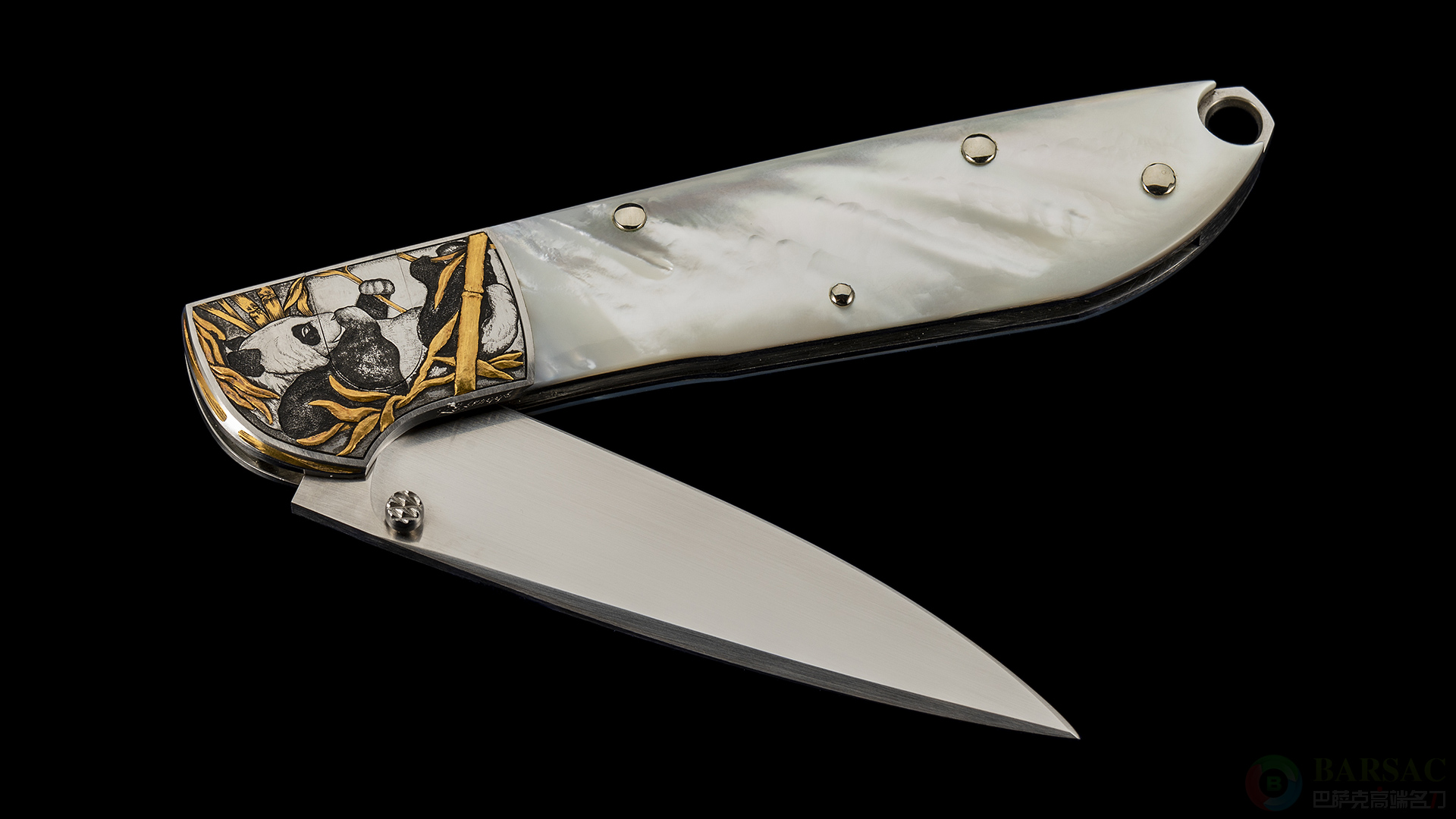这款熊猫折刀作品刀刃采用ATS34不锈钢研磨而成,缎面拉丝处理纹理笔直细腻。不锈钢推钮,开合手感如同在镜面上滑动一般,非常柔滑。刀柄为416不锈钢与珍珠贝母制作而成,解锁机关独特,是杜尔文特别设计的侧前方按钮锁,用大拇指按压护手侧面隐藏按钮即可解锁。