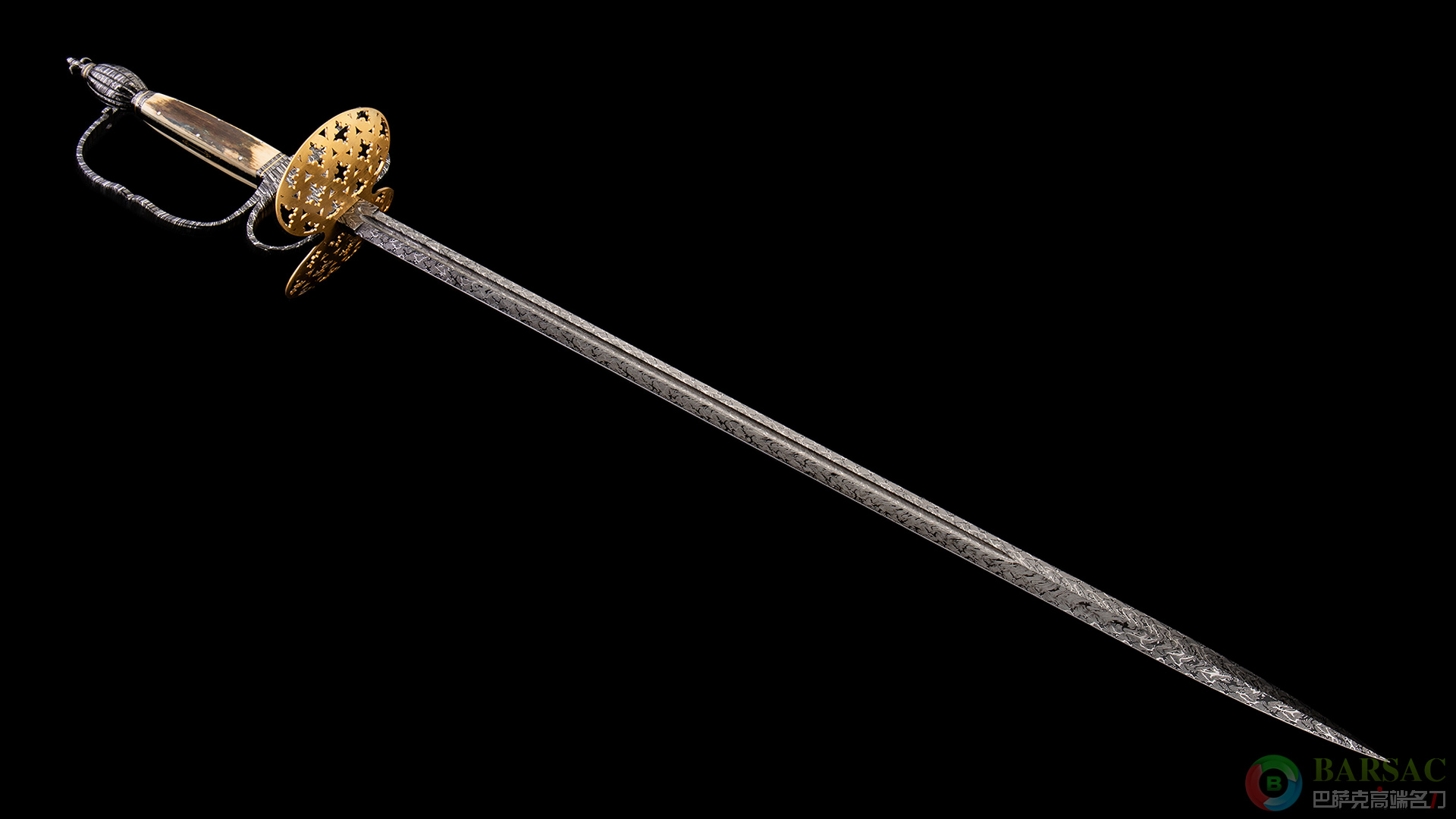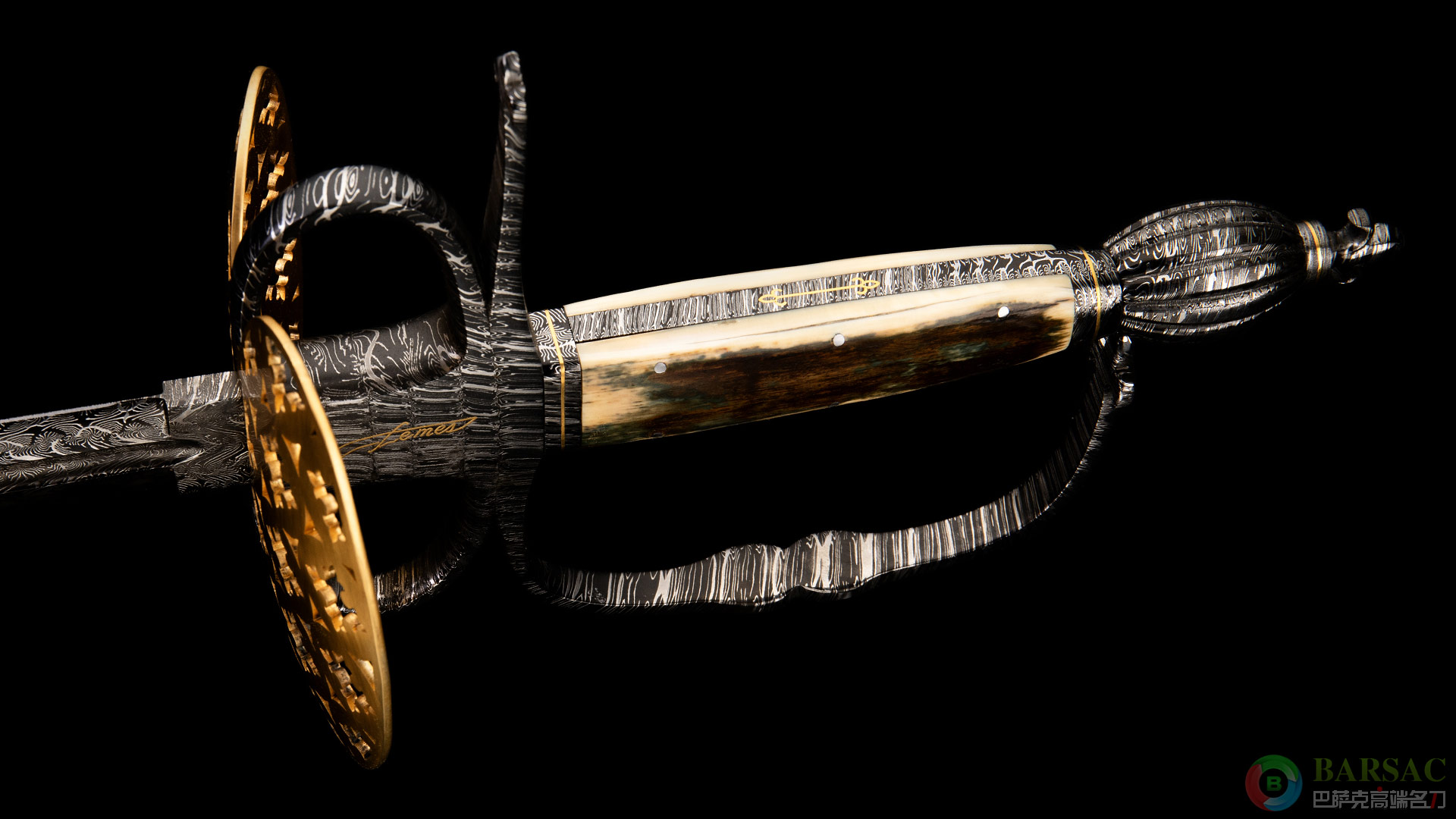 此剑借鉴欧洲经典古兵器之一的小剑,这种剑是在18-19世纪欧洲盛行的配剑,时常用于决斗以及礼仪场合。此件作品的护手采用大马士革以及铜制作而成,铜质护腕采用了漂亮的镂空设计,凸显出浪漫华美的艺术格调。剑柄采用猛犸牙化石制作而成,侧面镶嵌了黄金符文装饰细节。
