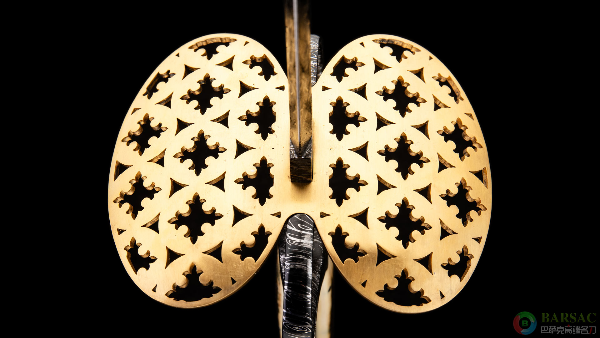 这款神圣女王作品剑刃采用亚历山大锻造大马士革制成,花纹带有类似含羞草植物的象形寓意,细密灵动,如同一望无垠的花海。剑刃中心带有犀利的剑槽以此强化视觉冲击力并减重,剑刃末端带有黄金镶嵌的刀匠铭文。