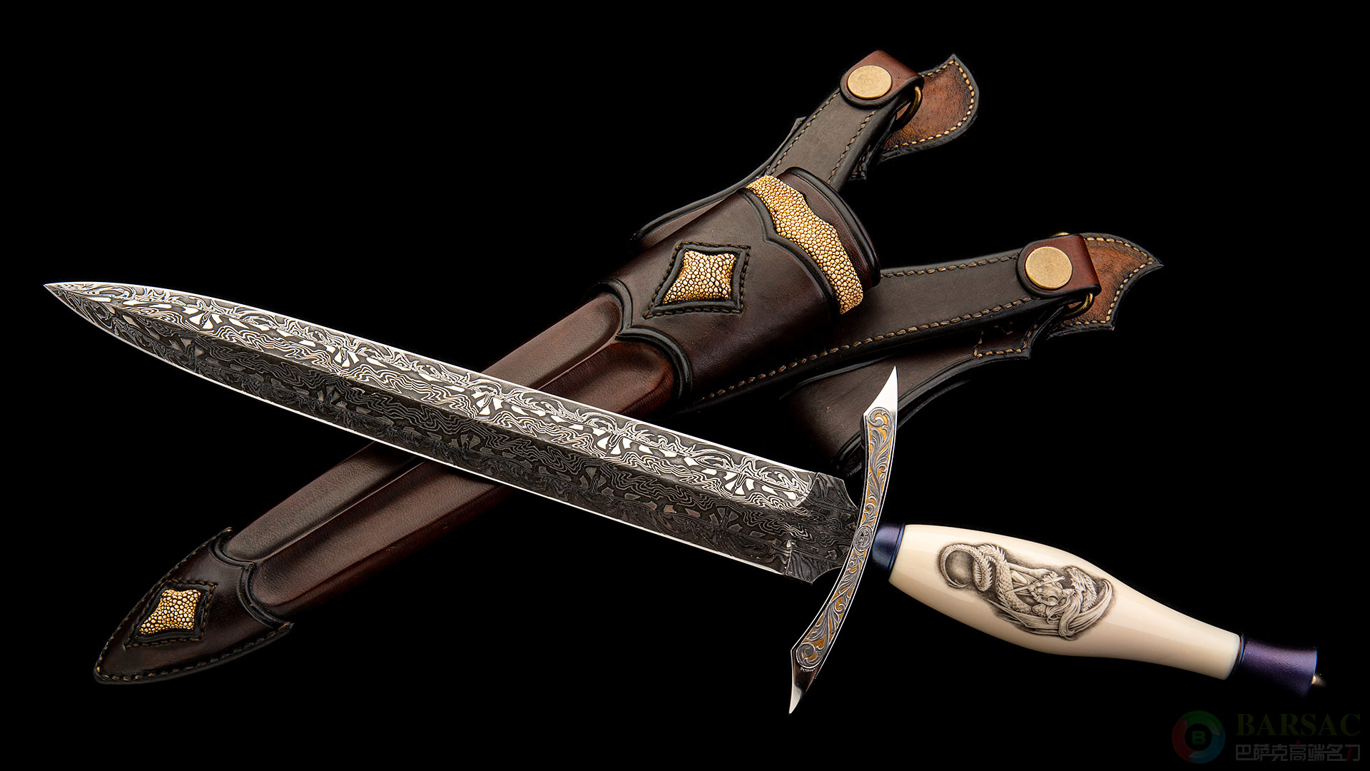 阿塔利亚同时是出色的皮艺家,剑鞘非常复杂,采用双色牛皮加珍珠鱼皮制作而成,剑鞘身线俊美,将宝剑烘托得更为迷人。除此之外,短剑还配有精美的背板,背板又展现了阿塔利亚出色的木工手艺,做工设计精美,为陈列带来绝佳的装饰效果。