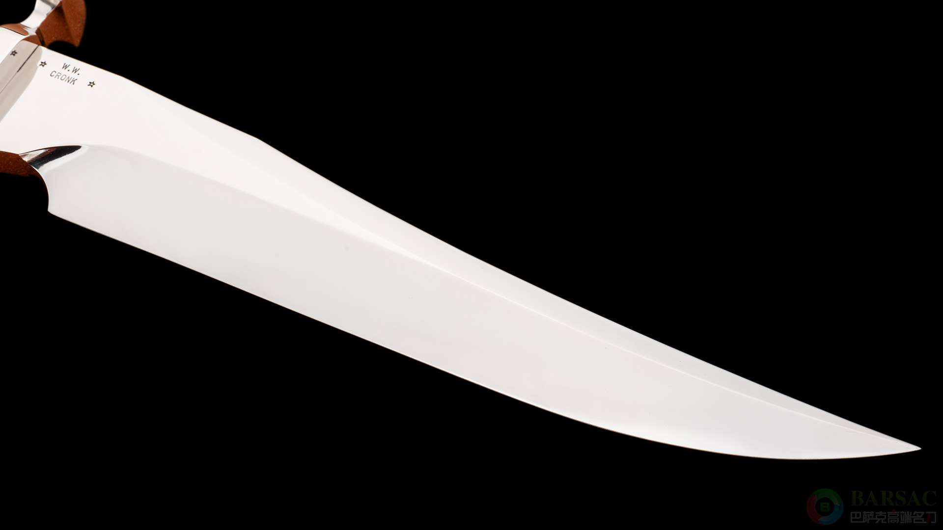 刀柄采用高级美洲胡桃木制作而成,此种木料相当昂贵,密度很高。刀柄外形被打磨成指握的轮廓,手感绝佳。克隆克后期的设计通常更为个性化,此件作品作为传统战斗刀,很好地展现了这位宗师作品的独特魅力。