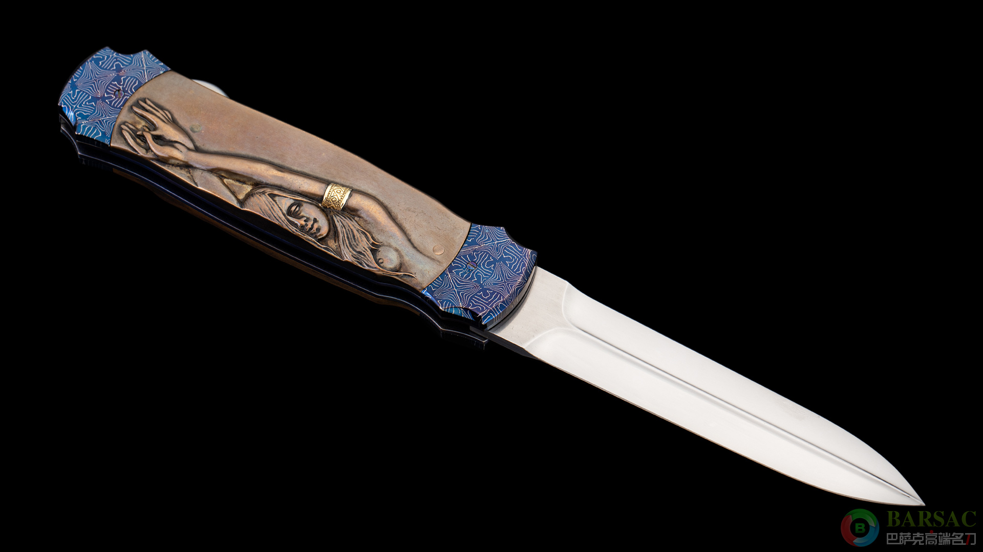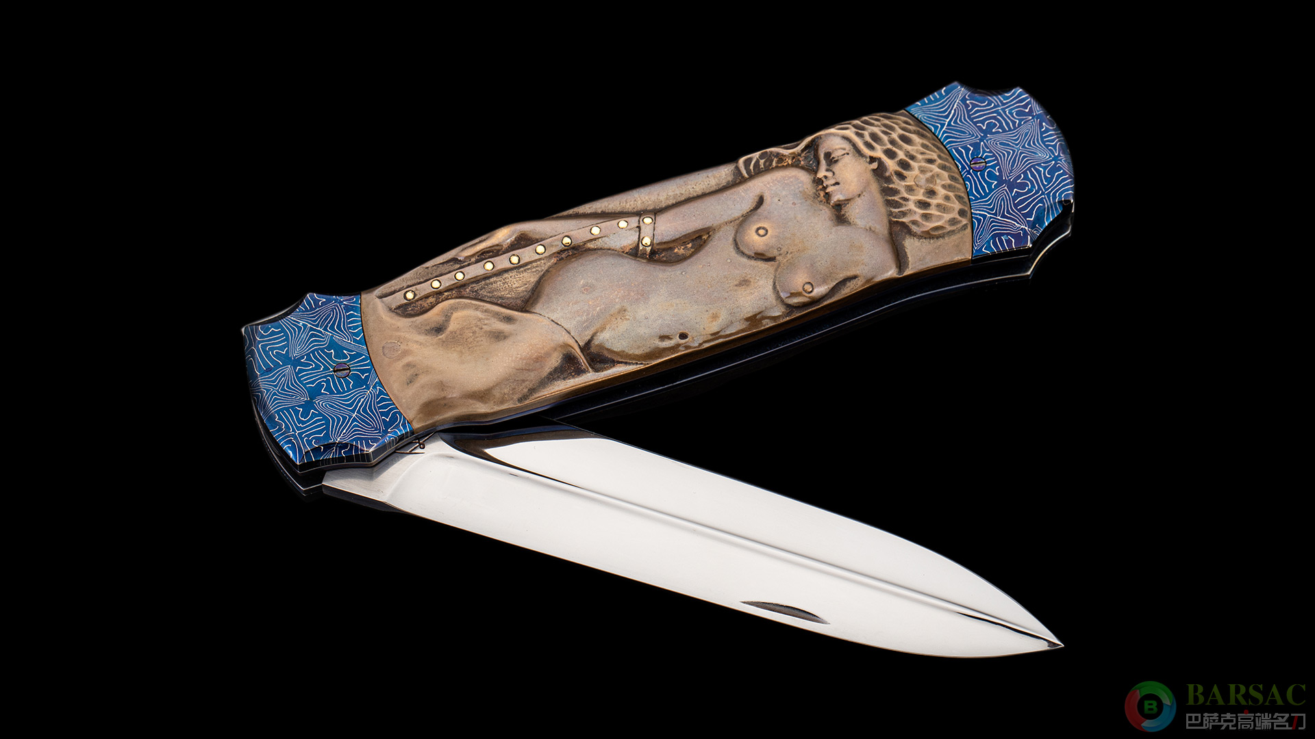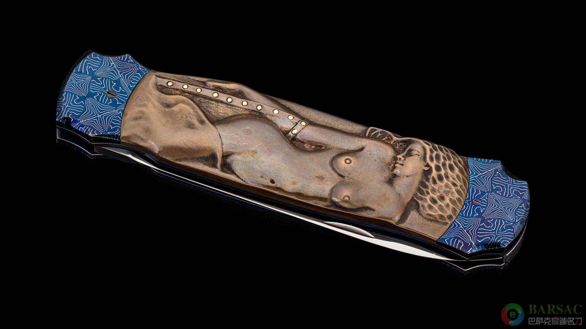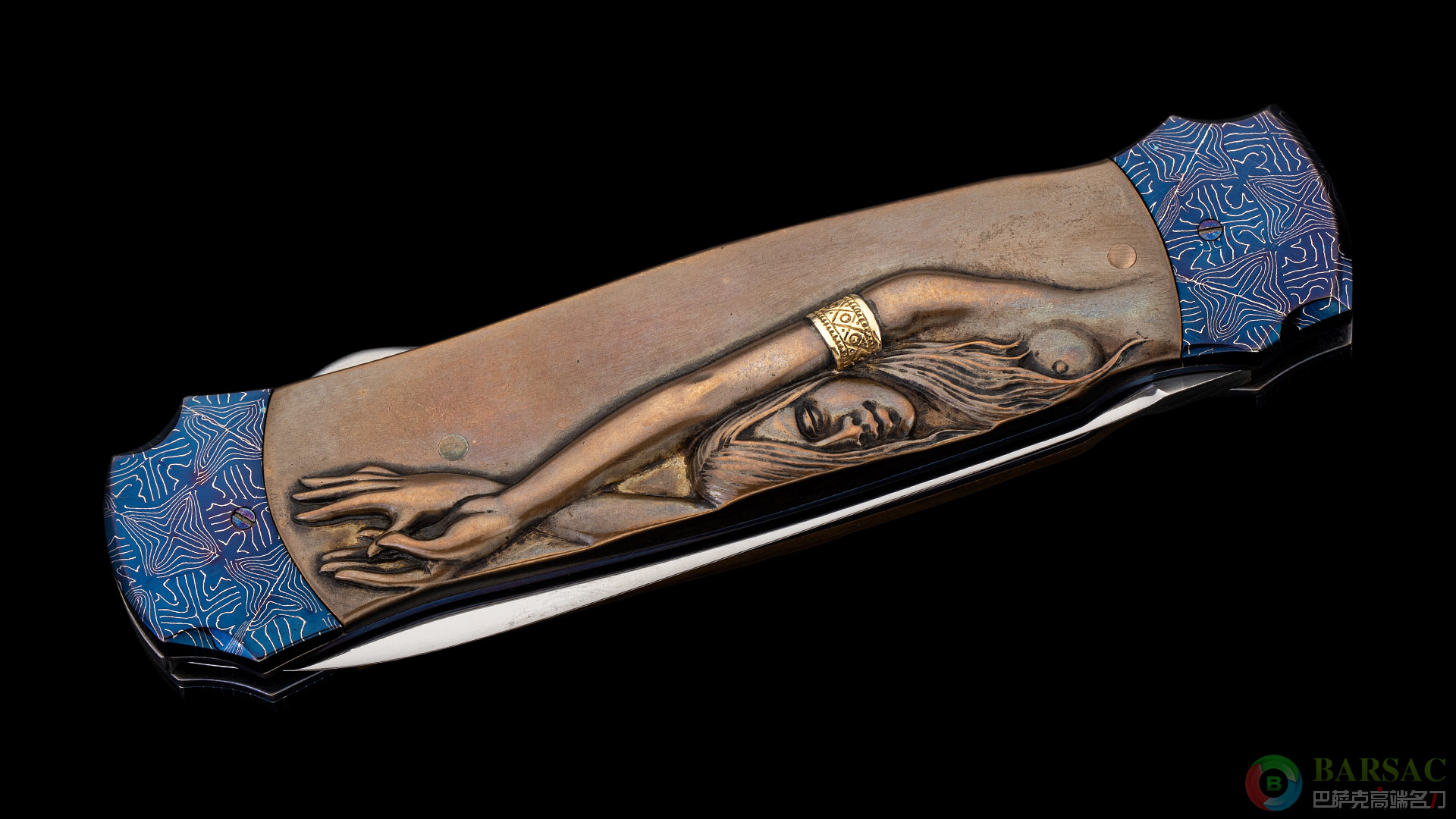 刀刃采用RWL34不锈钢制作而成,刀刃中脊线如同浮雕一样挺拔立体,刃面采用镜面抛光处理,光彩照人。刀柄两侧采用精美烤蓝大马制作而成,中部的黄铜浮雕刻画了两位迷人性感的女郎,女郎的手环以及皮带采用黄金制作而成。