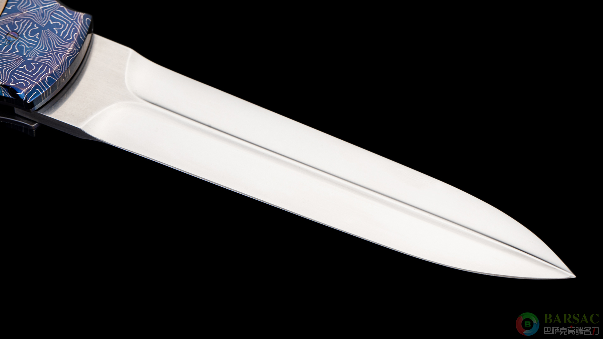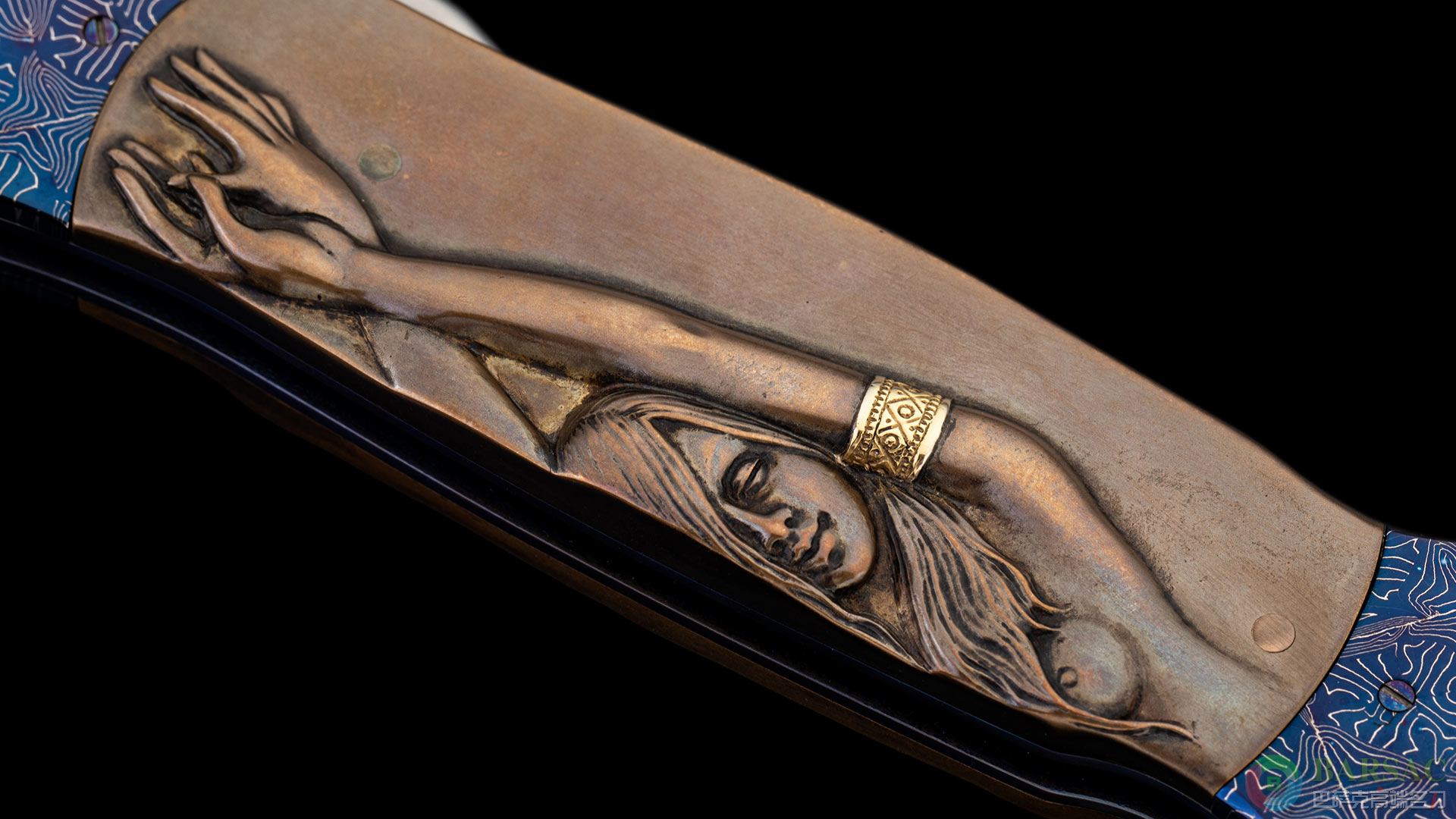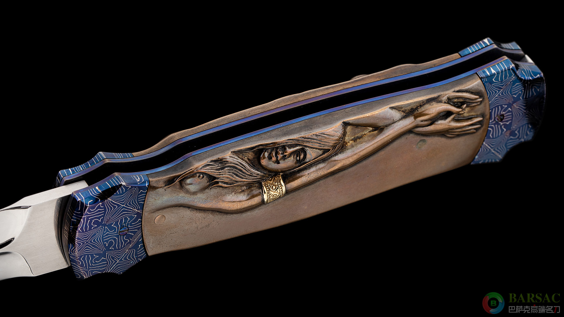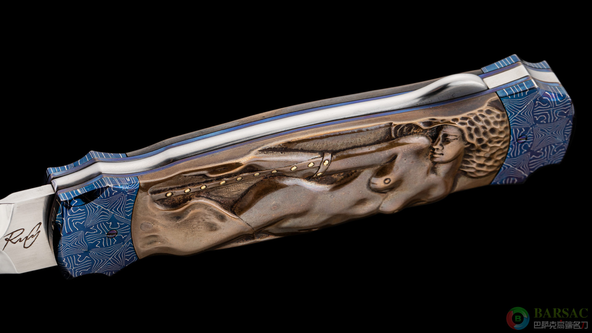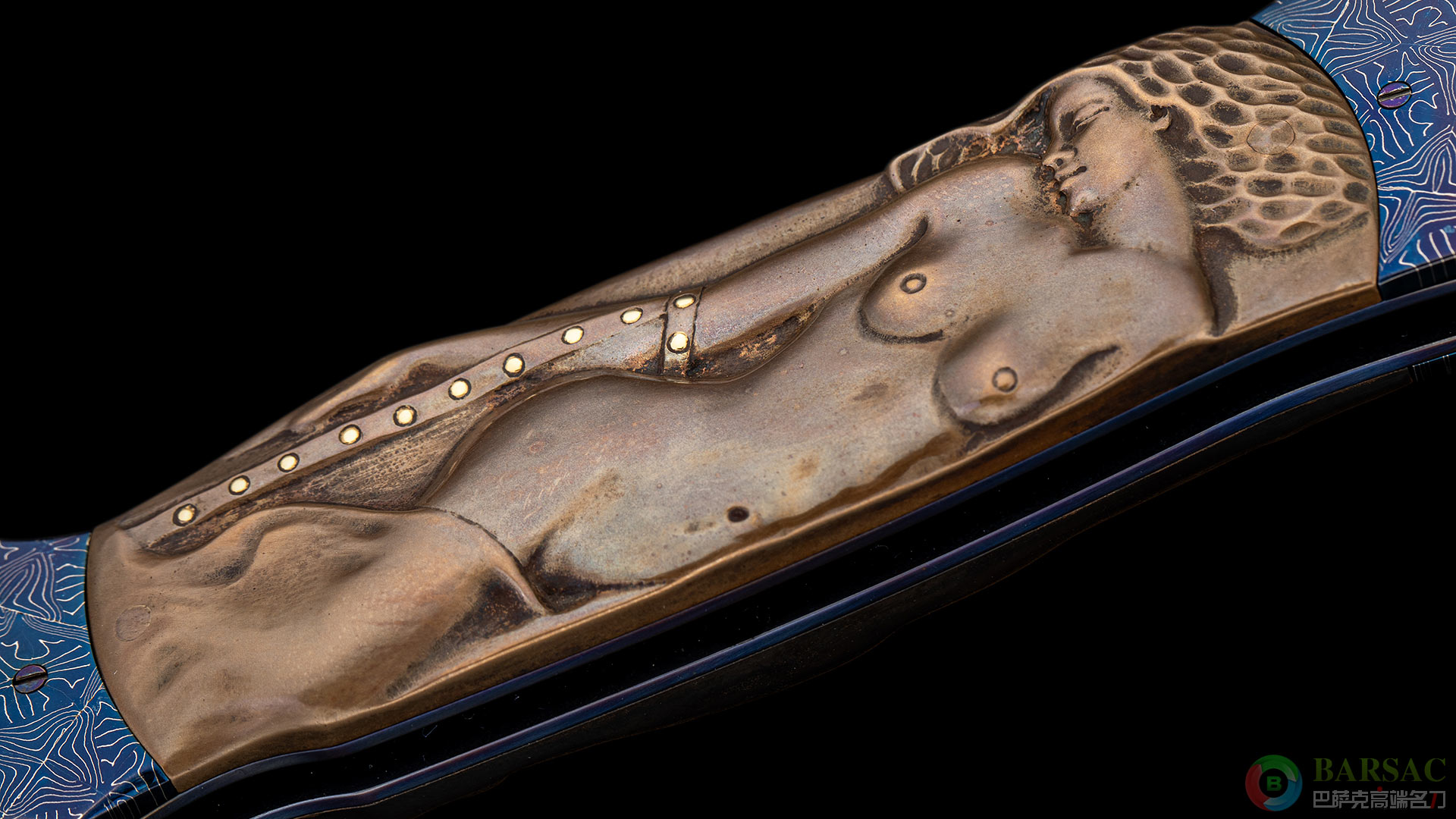 刀刃采用RWL34不锈钢制作而成,刀刃中脊线如同浮雕一样挺拔立体,刃面采用镜面抛光处理,光彩照人。刀柄两侧采用精美烤蓝大马制作而成,中部的黄铜浮雕刻画了两位迷人性感的女郎,女郎的手环以及皮带采用黄金制作而成。