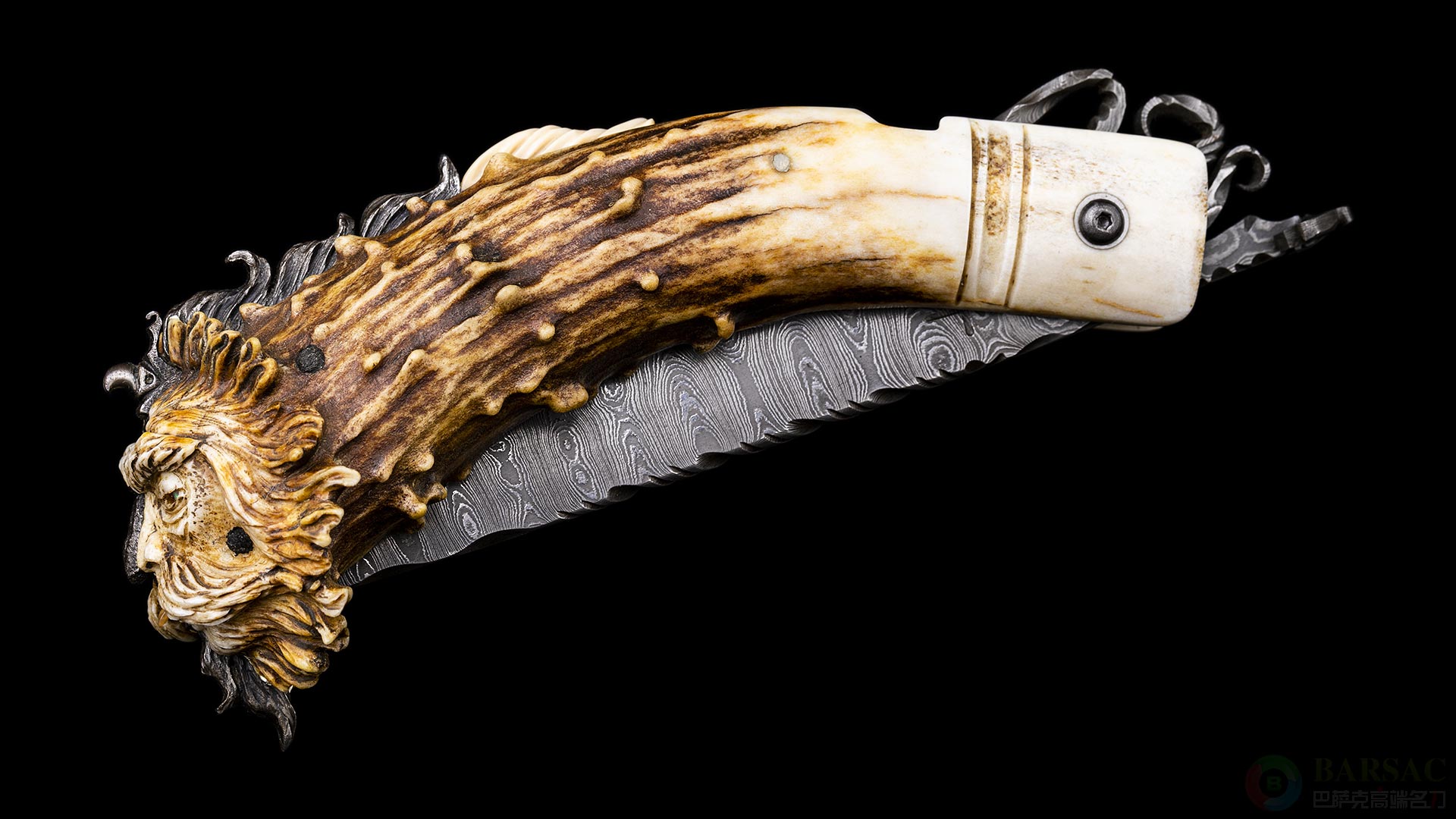 这款哥布林作品全长21.8厘米。刀刃采用拉瑞锻造大马士革制成,花纹细密连贯,动感传神。经典的鹿角角冠开脸,此件哥布林设定为一位苍老的法师老者形象,其面部扭曲如同受到了诅咒一般,然而右眼依旧炯炯有神,让人感受到高深的智慧与强大的法力。眼睛为欧泊石镶嵌而成,舌头为海象牙化石雕刻而成,嘴里镶嵌了黄金的牙齿。智者的胡须,眉毛浓密,均被刻画得栩栩如生,细节极其丰富,请大家仔细赏图。
