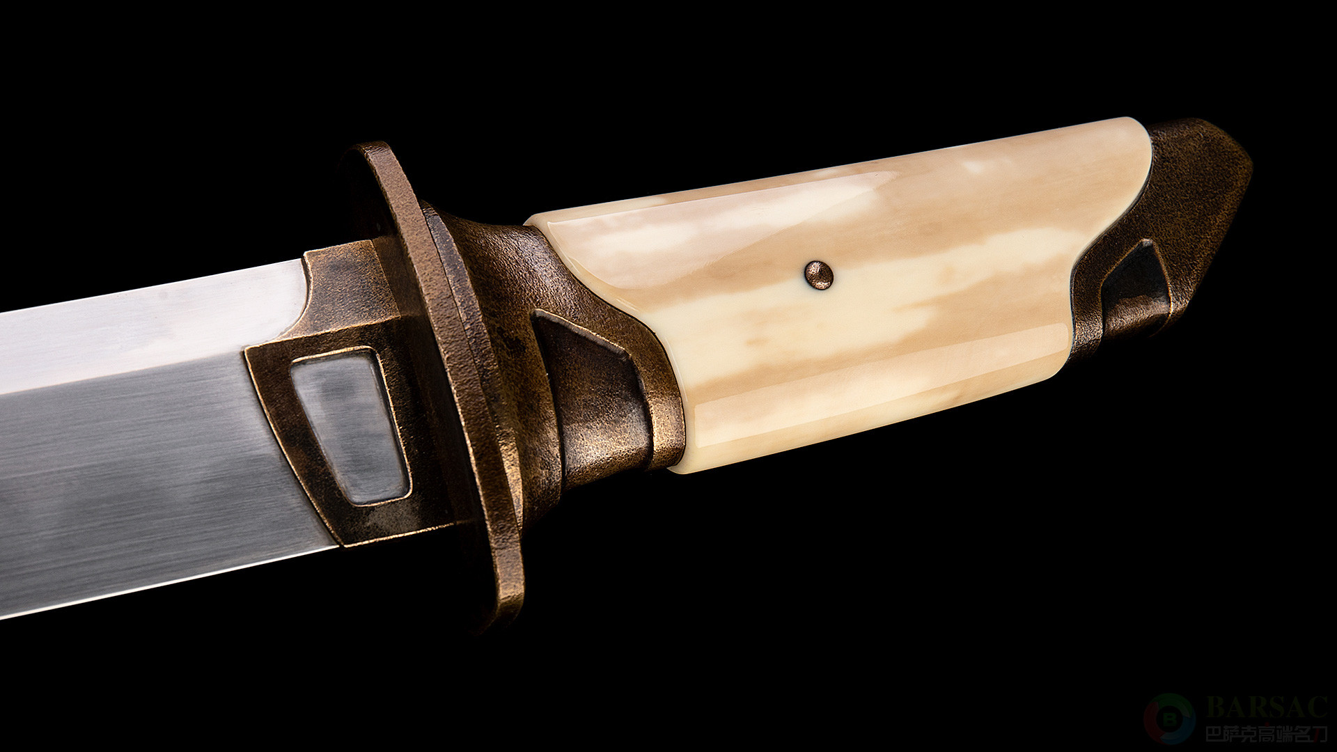 安德斯这款北欧王者肋差刀刃采用1050高碳钢锻造而成,研磨极其细腻,呈现出精湛的烧刃纹理。刀镡采用铜制成,简练霸气,表面肌理雕琢,看起来更有韵味。
