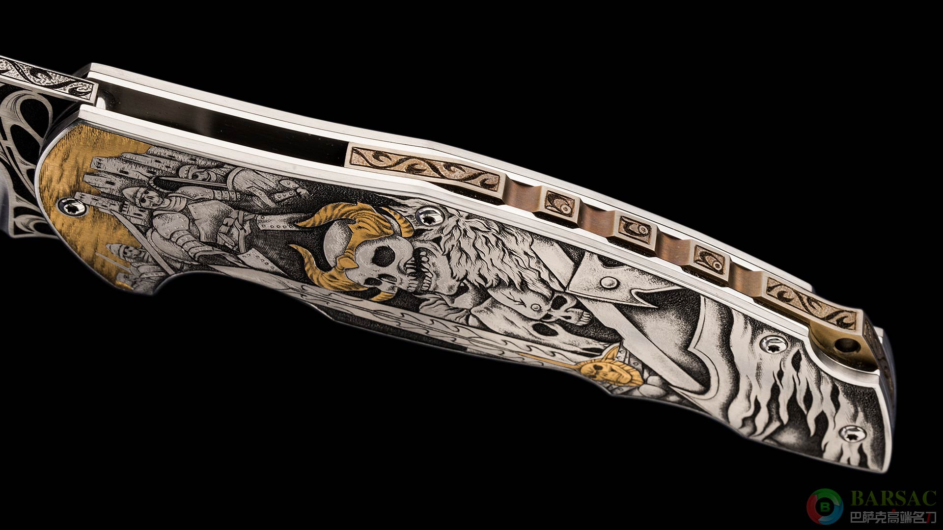 刀柄侧面背花同样带有雕花装饰,细节琳琅满目。整件作品外形前卫时尚,搭配充满哥特系风格的雕刻组合更是让人耳目一新,过目难忘。除了华丽的外表之外,作品的结构也毫不马虎,主轴采用滚珠轴承鱼鳍快开机构,开合顺滑,声音悦耳。此件作品可谓艺术与战术的完美结合。