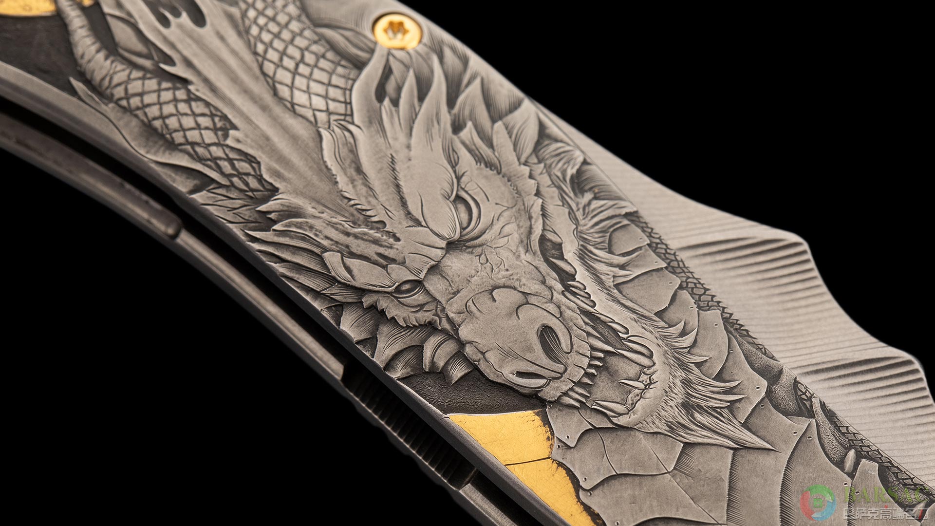 这款狂龙作品外形流畅简练。刀刃为高级CPMS90V不锈钢制成,磨砂镜面处理,刃面干净靓丽又带有一丝朦胧感。刀柄为钛合金制作,坚固轻盈,两侧全覆盖精美高浮雕。由雕刻师马基姆·巴伯金亲手操刀完成,采用精湛的高浮雕刻画主题。一侧展现了狂龙威猛凶悍的身姿,从神态到鳞片细节栩栩如生,加上黄金雕刻的烈日与龙鳍,画面更加华丽饱满。另一侧刻画了龙骨的浮雕,如同在X光照射下,狂龙健硕的骨架展露出来,形成震撼的视觉效果。