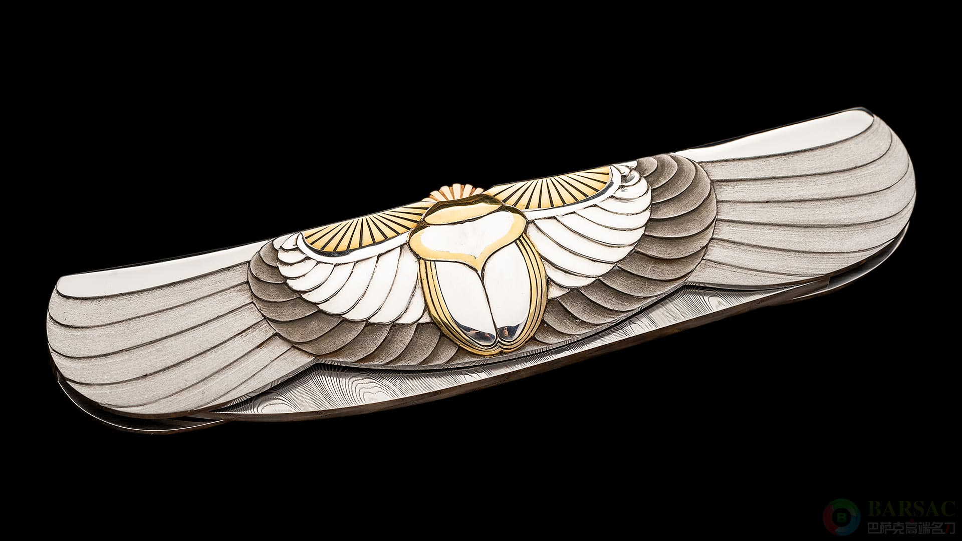黄金的圣甲虫浮雕占据着C位,两条眼镜蛇守护在两侧,当圣甲虫展翅之时,眼镜蛇化身为了丰盈的翅膀。羽翼的质感也具备数种变化叠加,象征着蜕变。刀身采用黄金背锁固定,柄槽侧面带有黄金制成的背花装饰。圣甲虫与眼镜蛇在古埃及神话中有着崇高地位,在各种影视题材中均有艺术亮相,此件作品大师通过杰出的技术,以新艺术风格作为基础,给人耳目一新般的视觉享受。