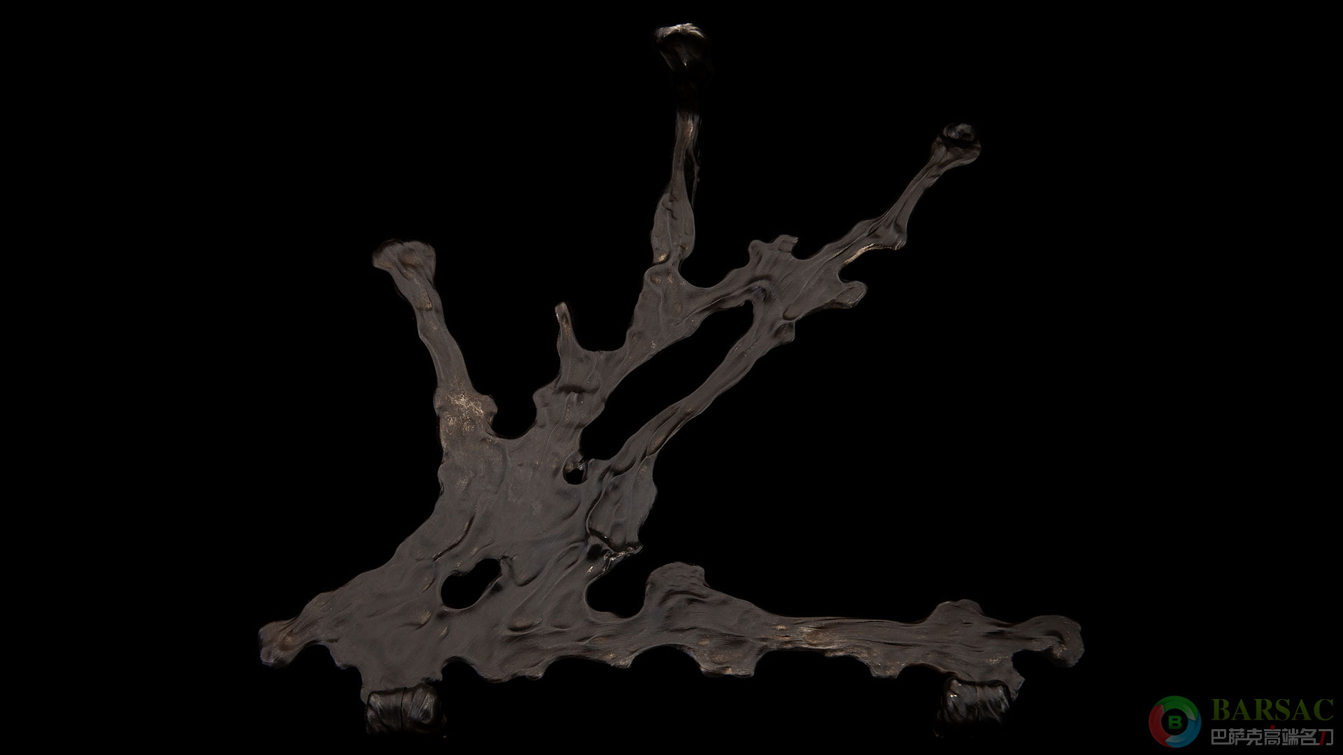 雕刻的肌理处理功力非常深厚,看似大巧不工,实则细腻无比。刀身与底座的组合设计也是非常巧妙,木板表面带有模拟水波的浮雕;当刀身嵌入木板之后再将金属挡板盖住刀身,不仅牢固而且在艺术形态上更是犹如章鱼的触须将章鱼身体包裹了起来,尤为生动。底座背面带有金属支架,可以将整件作品斜立起来,提供多种陈列方案。