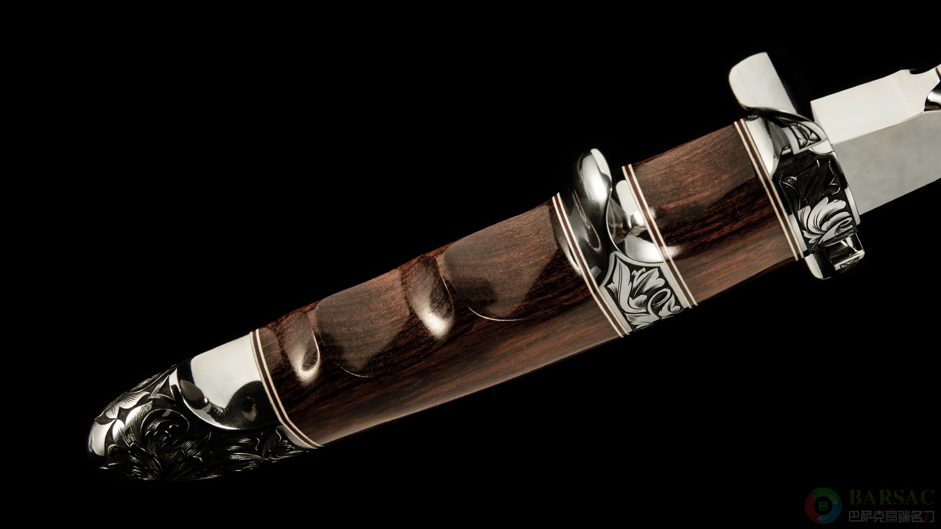 护手正面同时还雕刻有精美的手工雕花,美式卷叶风格,立体感强烈,由美国雕刻大师罗恩·斯卡革亲手完成。刀柄采用胡桃木制成,并做了切合手指持握的握槽,握感非常舒适。配有手工皮鞘,完美匹配宝刀。