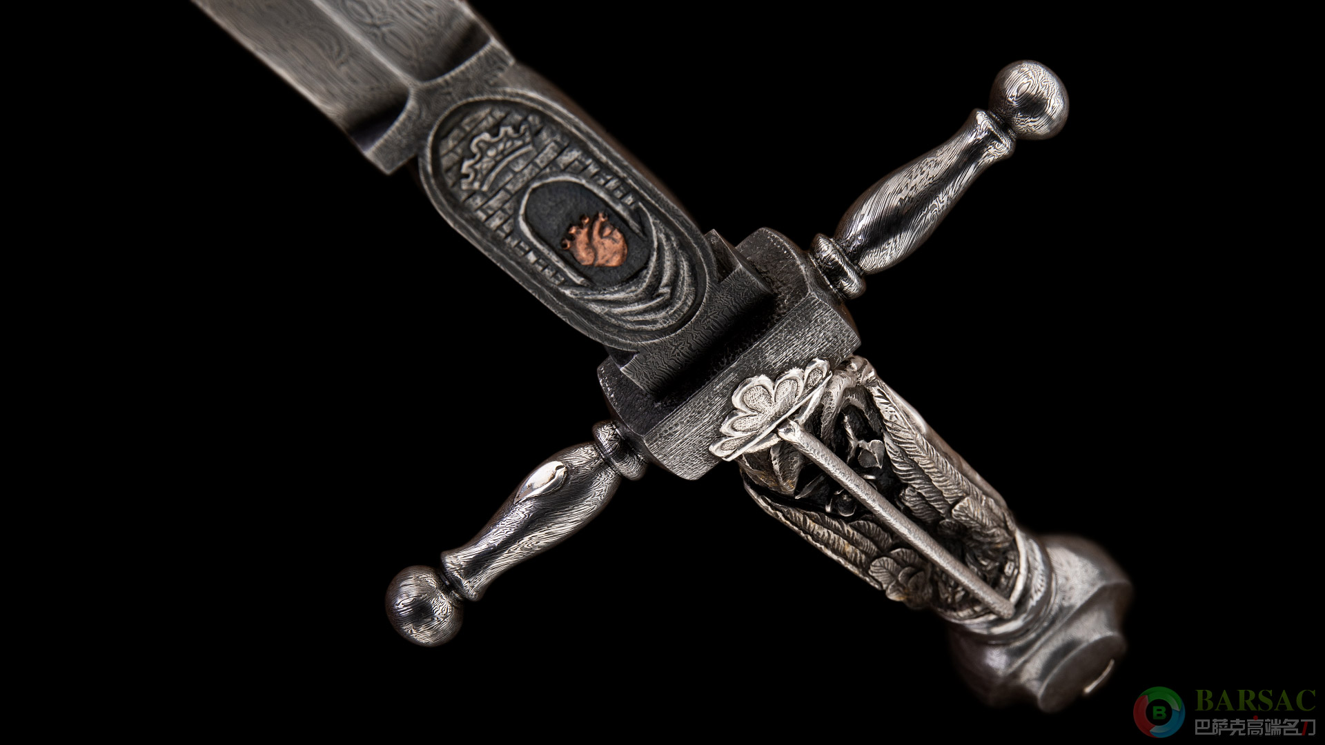 这款被囚禁的心作品以意大利建筑为启发灵感,剑型参考了欧洲古兵经典款式“高跟鞋”,修长的外形常用于穿刺敌人铠甲连接缝隙。通体由大马士革锻造而成,流露出古朴的质感与铁火气息。最为吸睛的还是手柄处的天使形象,双眼微闭右手扶胸,三根罗马柱将它牢牢困住,在这狭窄的空间里只能静等自己命运的降临……