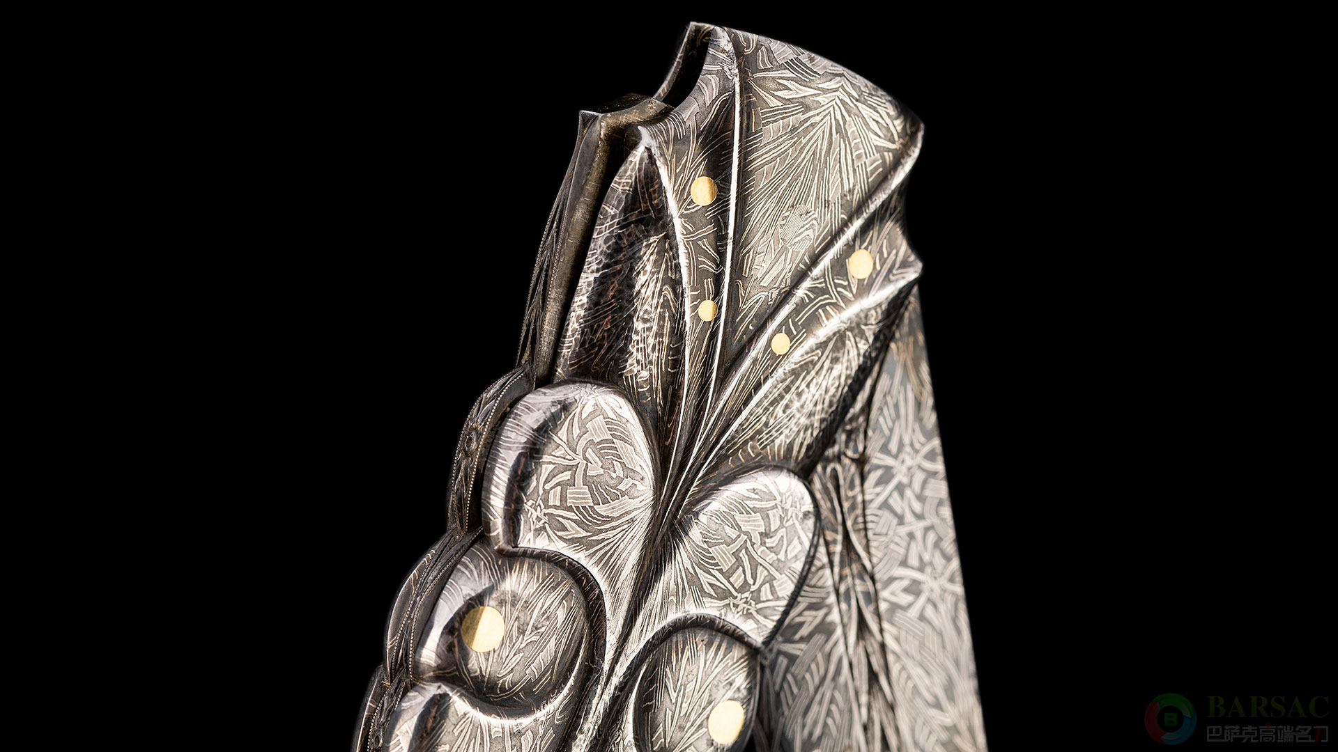 这款万花筒作品刀刃与刀柄采用锻造万花筒大马士革制成,花纹极为细密,如同繁花盛开的草丛,质感非常出众。整个刀柄被雕刻成抽象的卷叶外形,层次感极强,将本身就非常细腻的大马士革花纹衬托得更为美妙。刀柄上带有不同大小黄金铆钉的装饰,如同散落的露珠,风格自成一体。