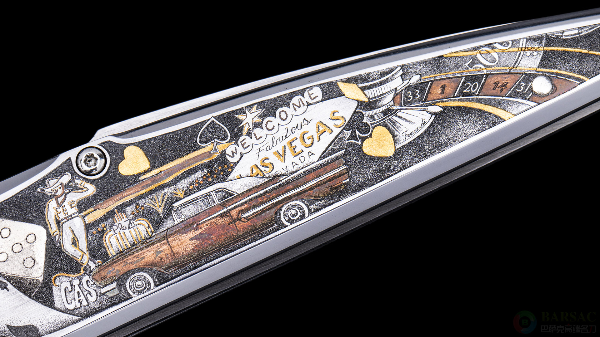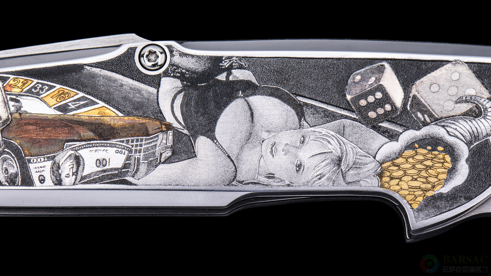 瑟奇奥·孔索力这款拉斯维加斯作品全长23.5厘米左右,刀刃采用RWL34不锈钢制作而成,刃型流畅。刀刃采用RWL34钢手工缎面拉丝表面处理,假刃镜面研磨,滚珠轴承,快开迅猛有力。刀柄采用416不锈钢制作而成,雕刻由西蒙尼操刀,西蒙尼为意大利雕刻家代表,年纪轻轻就已经取得不凡成就,其雕刻技法也相当全面。雕刻以金钱与欲望的都市-拉斯维加斯为题,美女、跑车、各种赌具以及美元无不都是这种城市的代名词,部分图案更是使用了高浮雕技法,黄金与铜的点缀也为这座城市注入活力。柄侧面雕刻为扑克牌的四种花色,同样起到呼应主题的作用,每一方寸的细节都做到了尽善尽美。