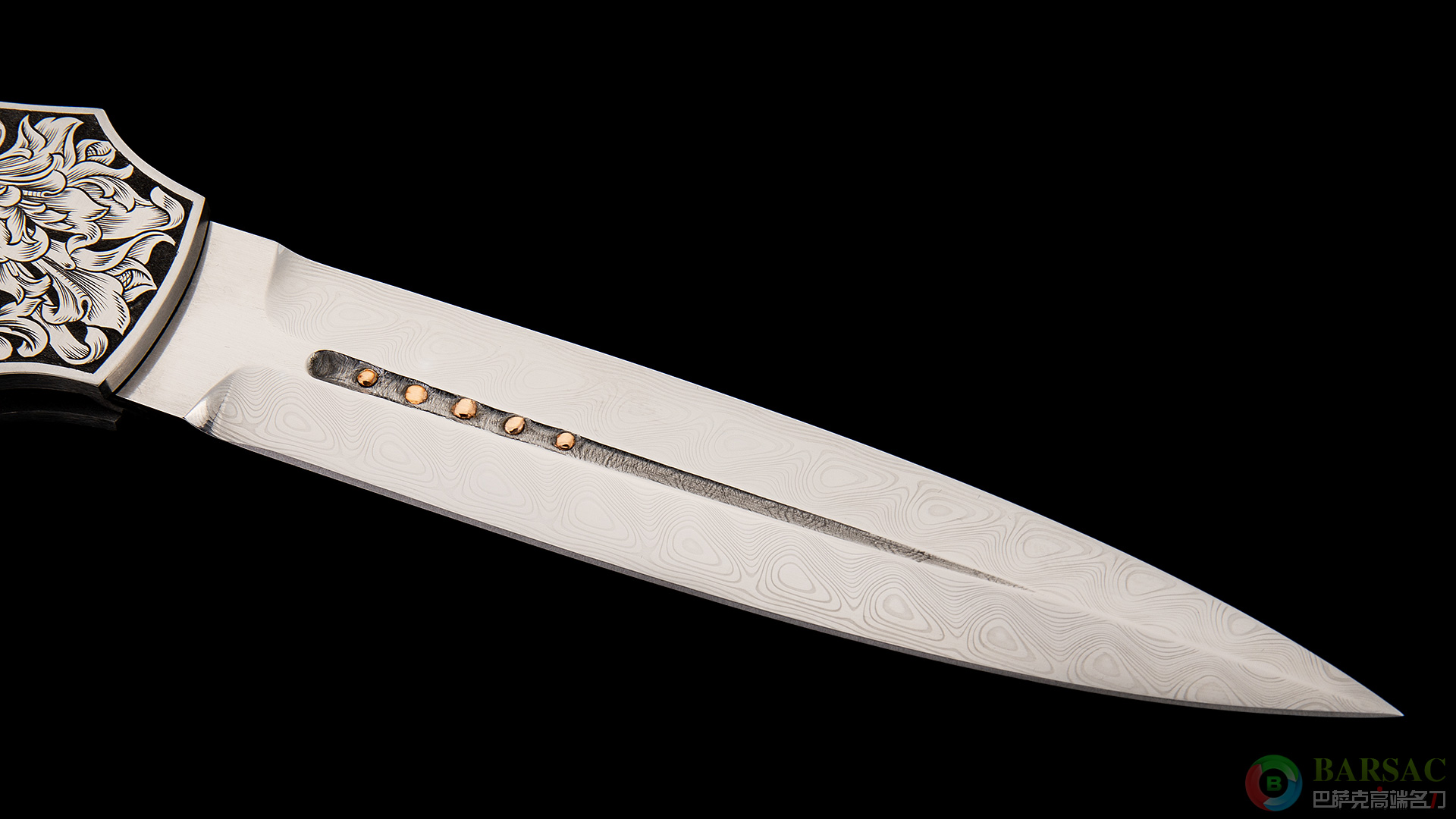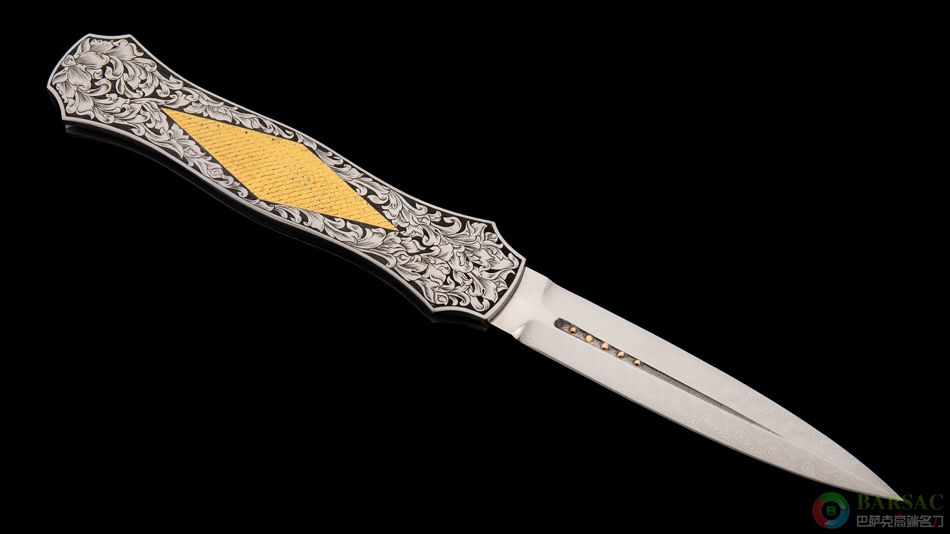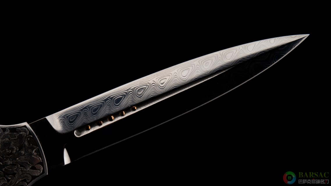 刀柄两侧由美国雕刻师爱丽丝·卡特操刀,满雕美式卷叶图案,最醒目的莫过于刀柄中心菱形黄金上的华丽棋盘格图案,将作品的奢华拉满。整件作品尺寸巨大且做工细腻,绝对是喜爱高级侧跳朋友们的佳选。